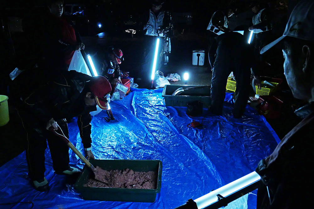 私の対戦相手は金澤さんと森井君、場所は椛島周辺の“池の小島”3人で1時間交代で3時間の対戦。場所決めジャンケンで真っ先に負けて選ぶ権利無し、一番右側からのスタート。暗いので明かりを借りて仕掛けを作ったけど、予備の竿とリールを出して仕掛けを作ってしまいました。