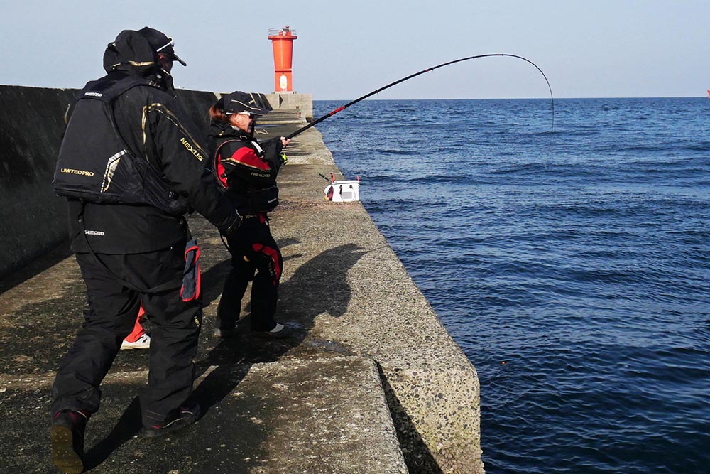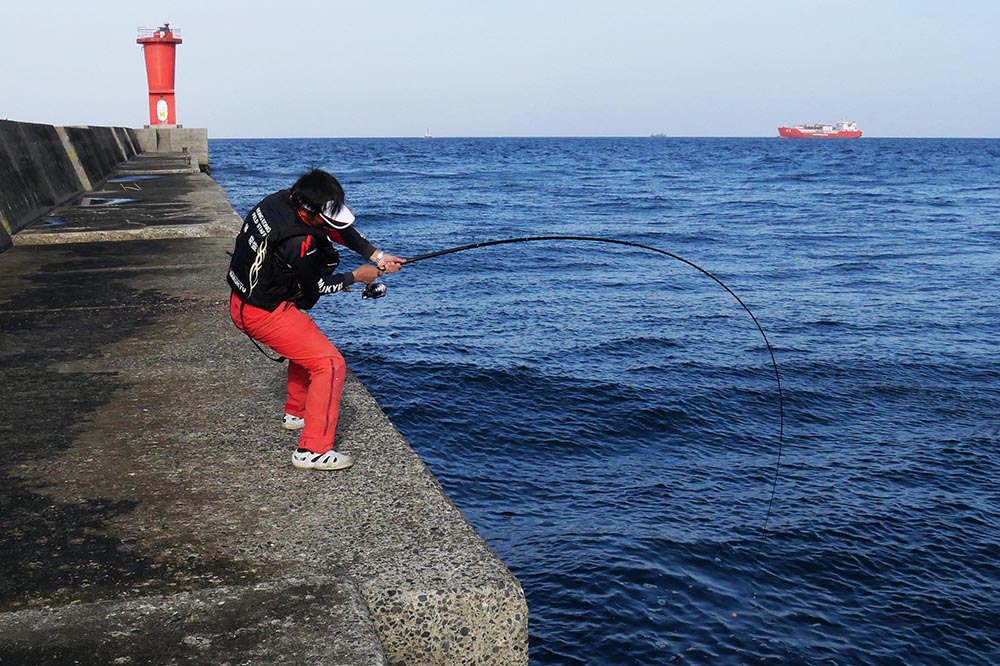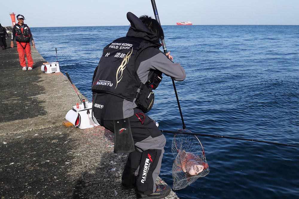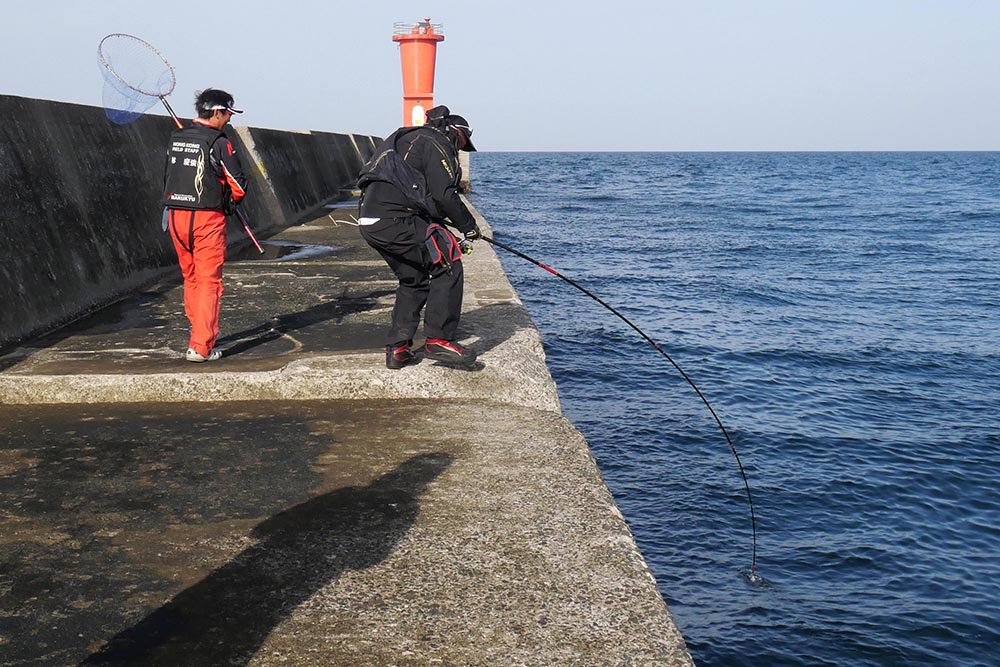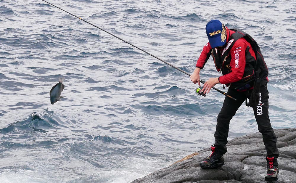 ワニの3番で良型グレを取り込む中山さん