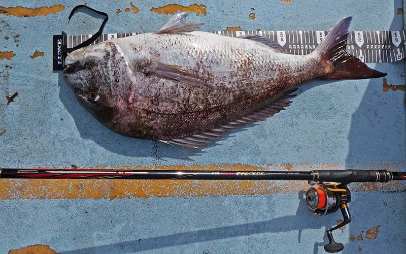 兪さんは完全フカセ、奥さんはゴム張りガン玉5号を付けて、操作ミスが有っても確実にサシエが沈む仕掛けです。その甲斐あって、尻尾が切れていなければ50アップのチヌ2枚と74~78㎝のマダイを2匹ゲットしてくれました。