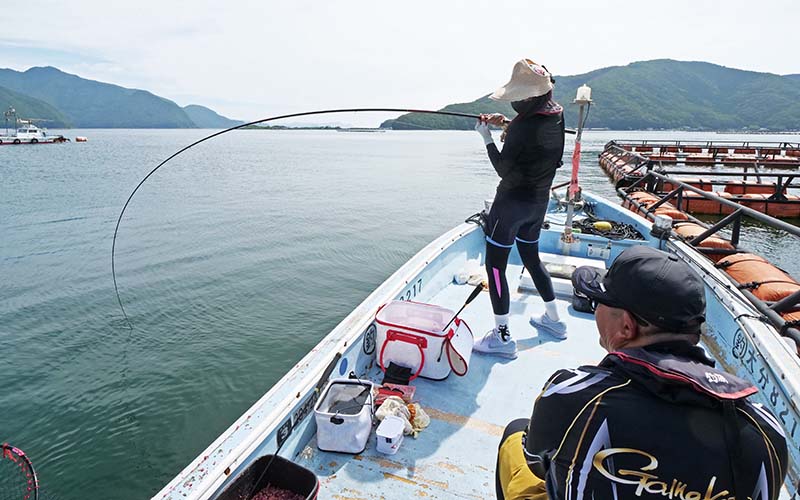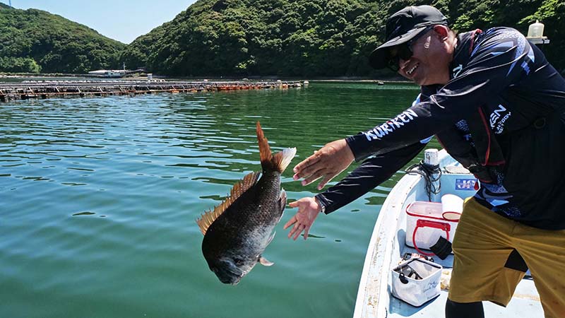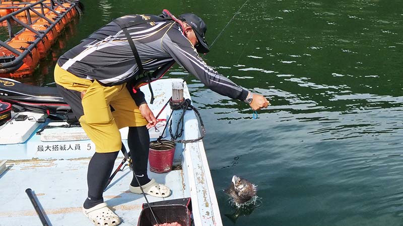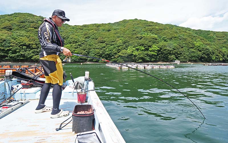 しかしながら今回はトウゴロウイワシが多く、オキアミ以外は殆ど喰い尽くされてマキエが効き難い状況で、場所変えを2回ほどした午後に北東風が吹き始め、この風を利用した骨生簀に掛かり、網生簀を狙って漸くアタリでした。