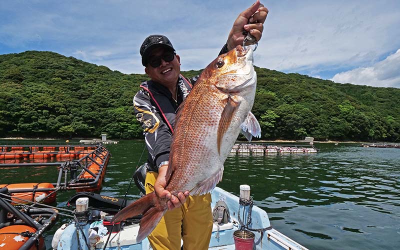朝の一投目で5.6㎏のマダイが来てくれました