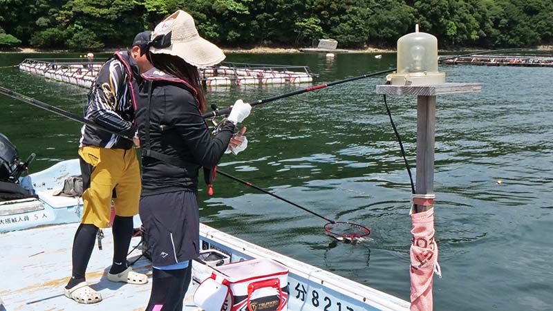 前日は南風が強く、骨生簀が網生簀に近付いており、マキエに釣られて網生簀の下に居るマダイが移動して来て釣果が伸びたのです。でも今回は風が無いので網生簀と骨生簀の距離が遠く、別の骨生簀から網生簀のマダイを狙う事に。