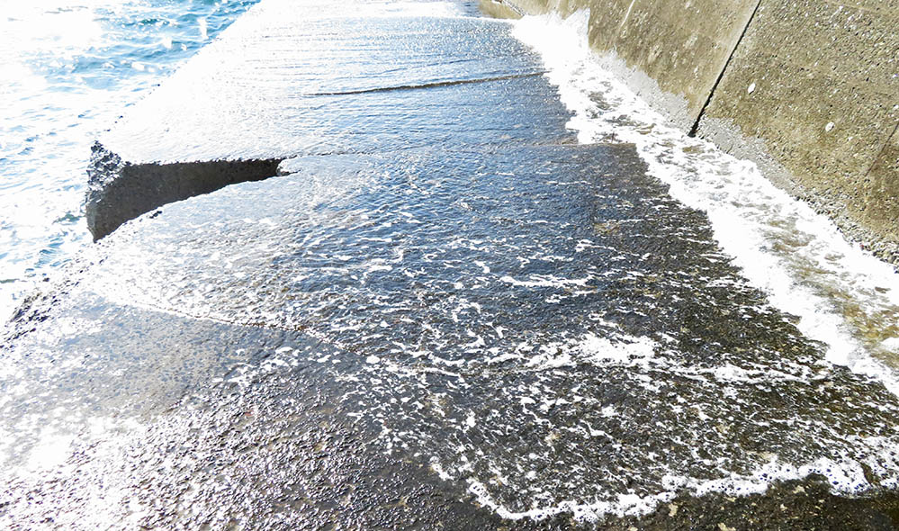 東からのウネリで、横島一番は満潮前後で船付場が大波を受ける状況。