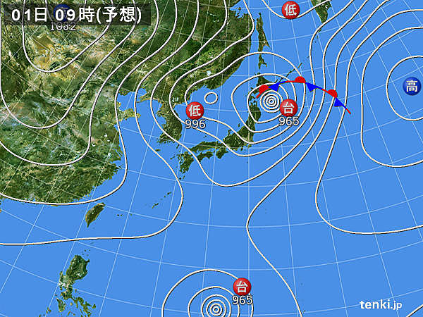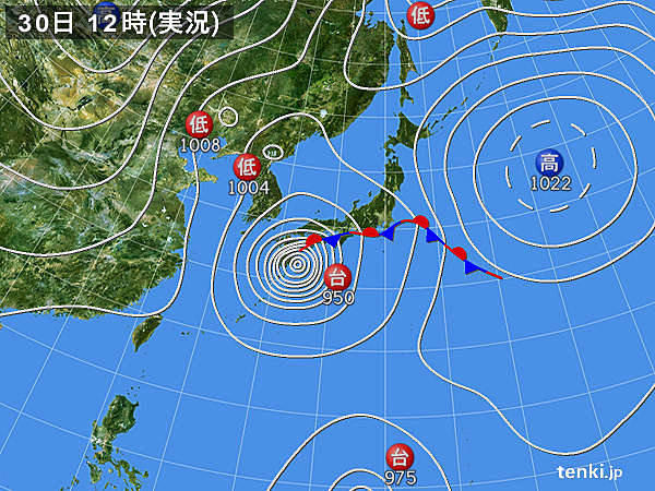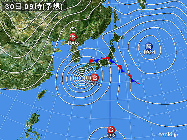 通常は965~980hPaくらいで、大分付近を通過する事が多いのですが・・