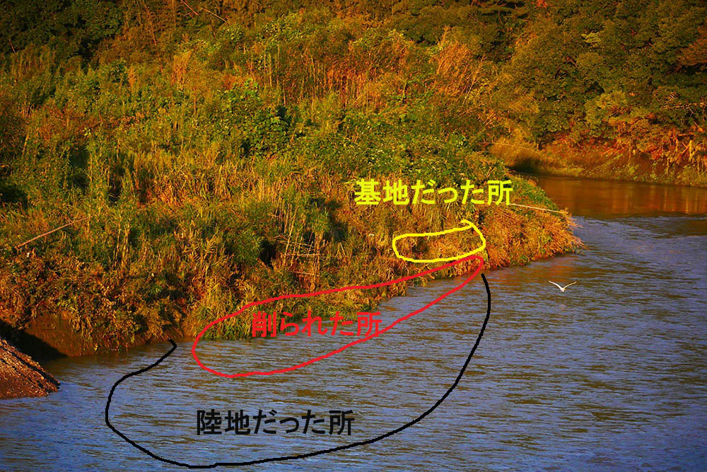 台風24号の雨で増水した流れが土台を削り取り、基地を破壊してしまいました。以前の基地の下流に新しい骨組みを設置したのが28日。これも僅か4日で使わずに消失!