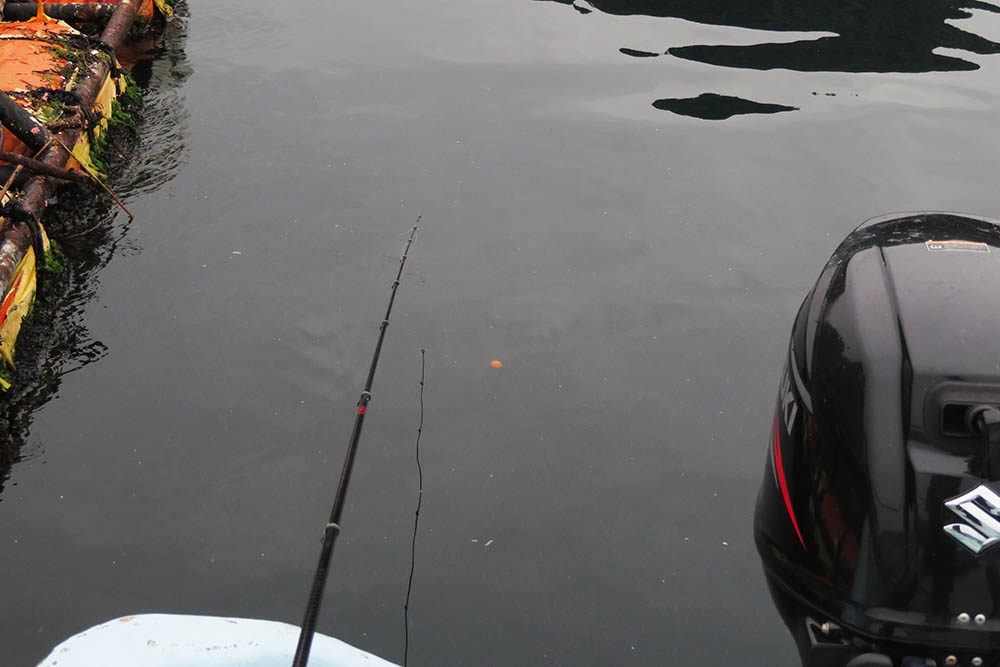 湾内にはウネリの大きな沖から避難してきたイケスで一杯。許可されたイケスで竿を振りますが、許可を受けた水産会社の船が着くイケスを確認し、3ヶ所で竿を出しました。