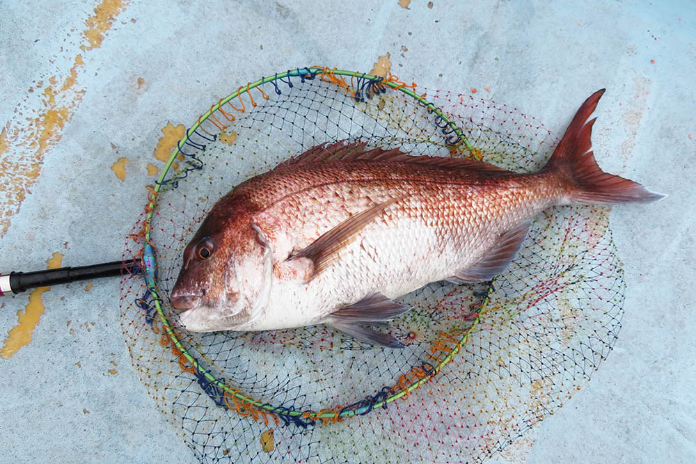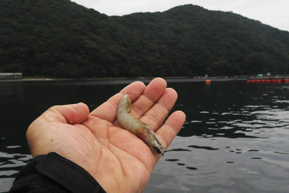 ムキミで狙うとアジが多く、釣れるのは24~25㎝ほど。仕方なく白エビの一匹掛けで狙っていると本命のアタリ。残念ながら70㎝に満たない中型のマダイでした。