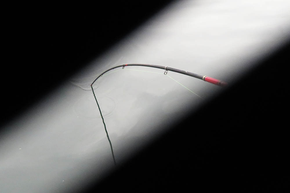 場所交代後の午後、再び戻った対岸のイケス、今度は一匹掛けの白エビに良く引く魚がヒット。マダイではない、チヌでもない、ボラでもない。スピードはあるものの、重量感は無く、バリの様にガタガタ引く感じが手元に伝わってきます。