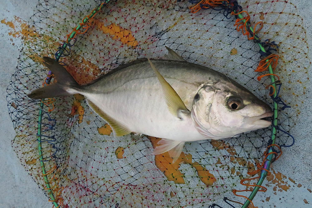その魚はシマアジ。湾内でこれだけのシマアジは初めてです。沖のイケスなら何度も釣っているのですが、ビックリ仰天の高級魚も食材として確保出来ました。