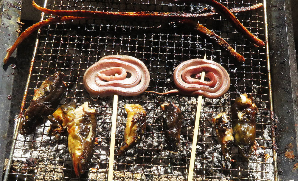 食材は、猪肉6~7㎏(猪鍋)・天然ウナギ10本(蒲焼き)・ケンサキイカ10枚(刺身)・マムシ2本(蒲焼き)など確保完了。後は天然アユ・モクズガニ・大型マダイなどの予定。