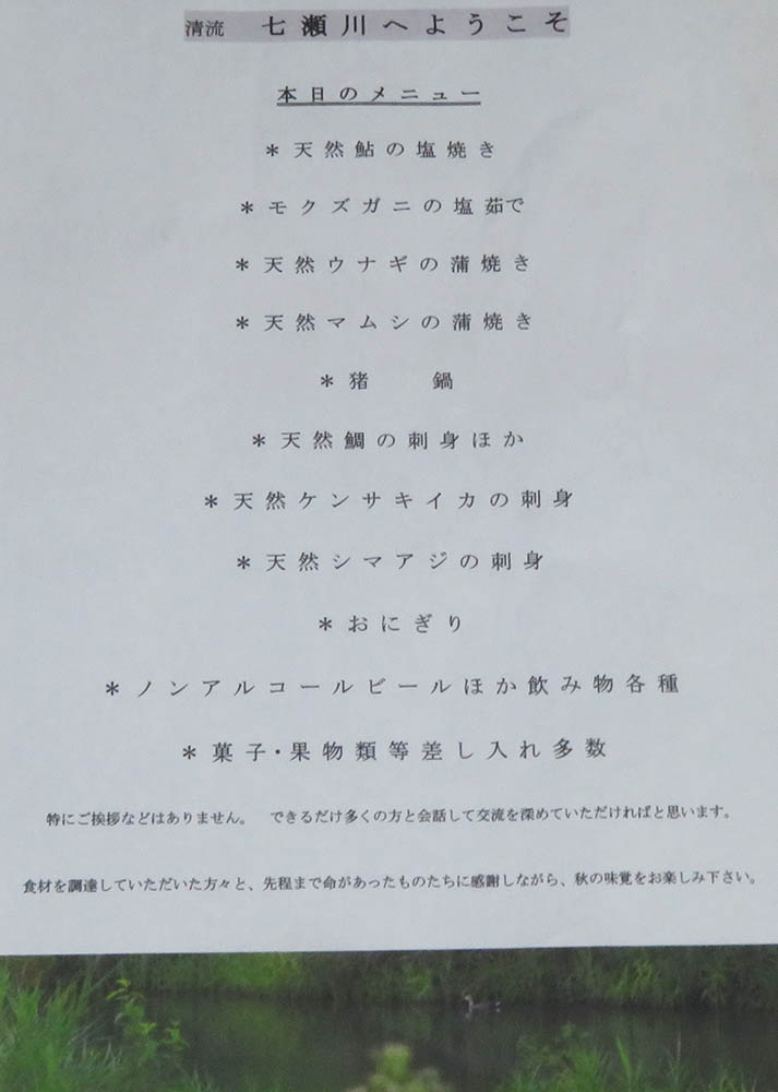 それでも参加して、天然ウナギ10本・天然アユ50匹・猪鍋・モクズガニ40匹・イカの刺身10枚・マムシの蒲焼2匹・80㎝マダイの刺身予定・・などを食べたい人は来て下さい。