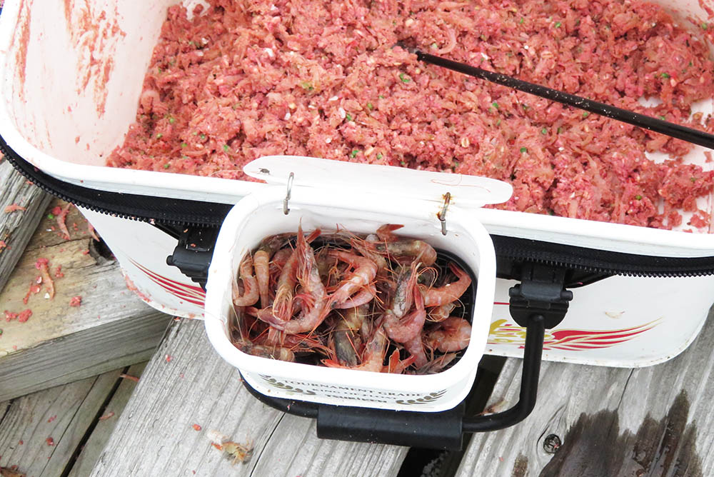 シバエビ、アジ狙いはムキミで使い、アジを交してマダイ狙いは殻付きで使う