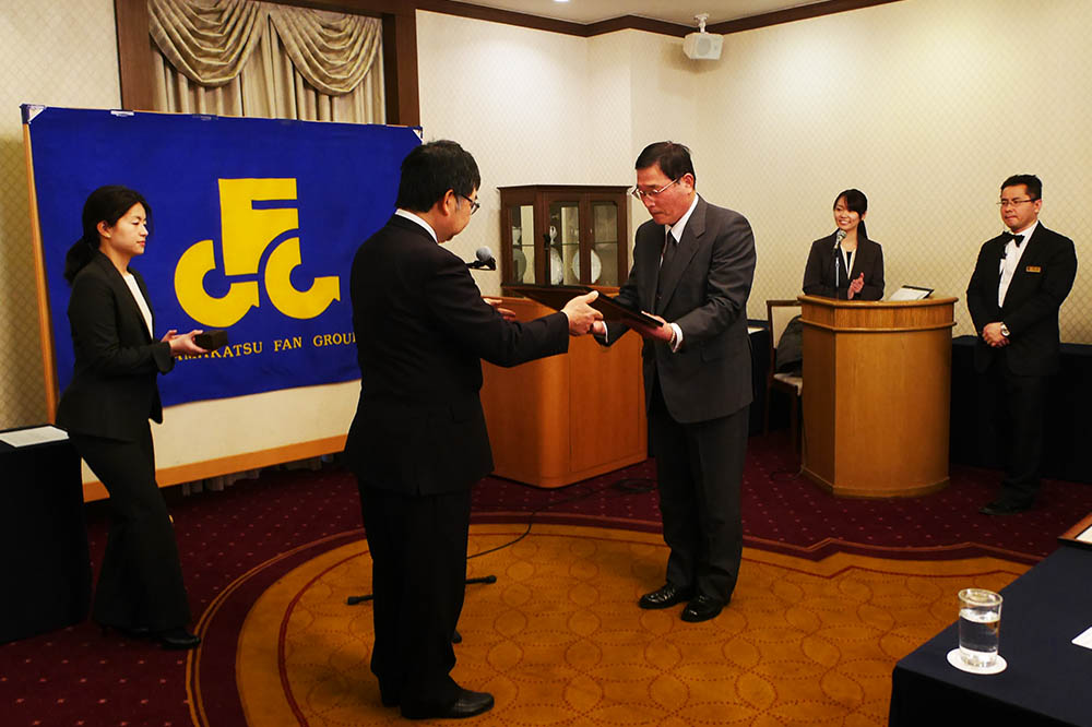 GFGとは“がまかつファングループ”の事です。全国に4000人近い会員たちがGFG会員として活躍しており、今回は25年間も継続してGFG会員を続けて頂き、“がまかつ社”に援護射撃をして頂いた方々への表彰式でした。