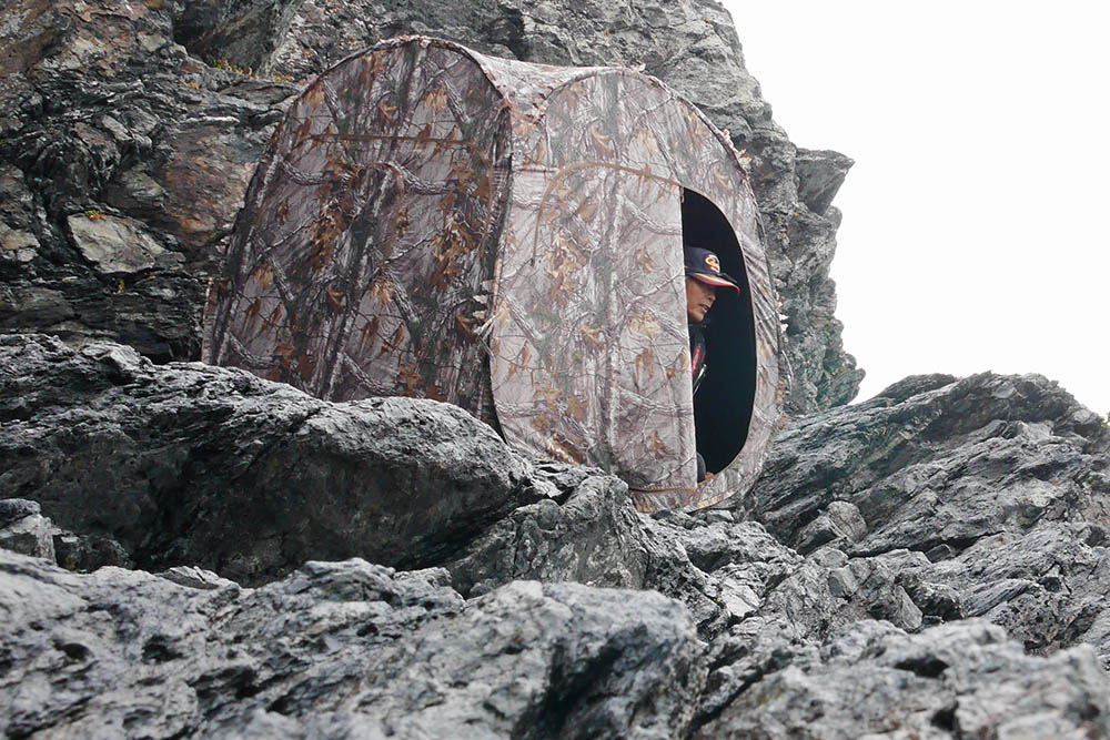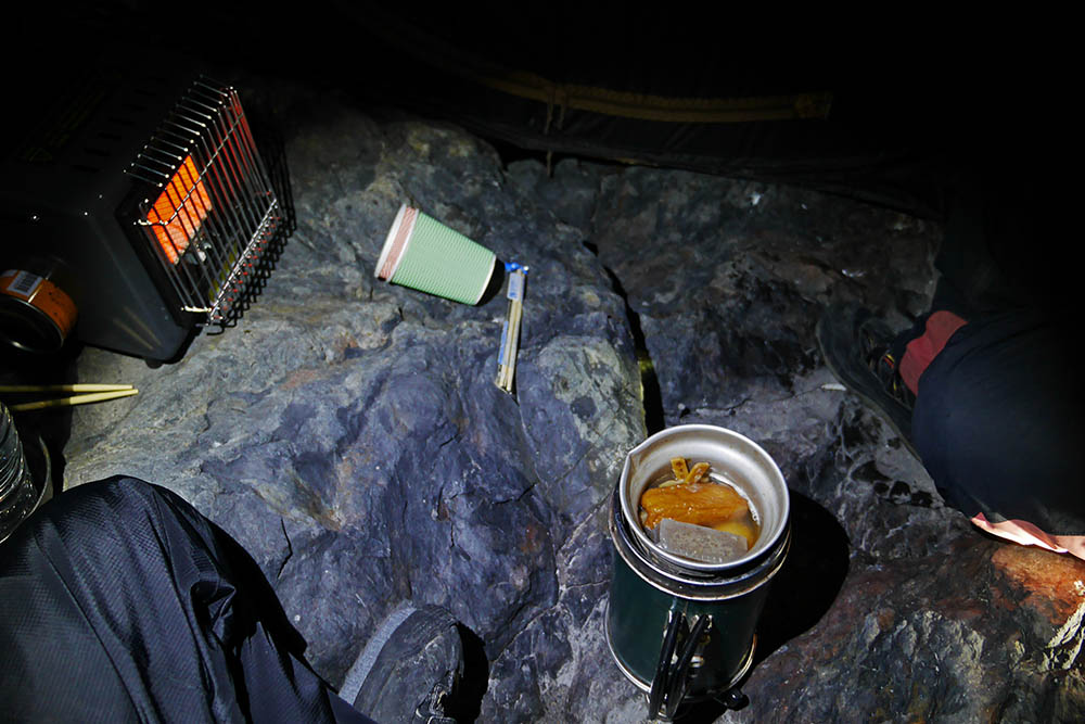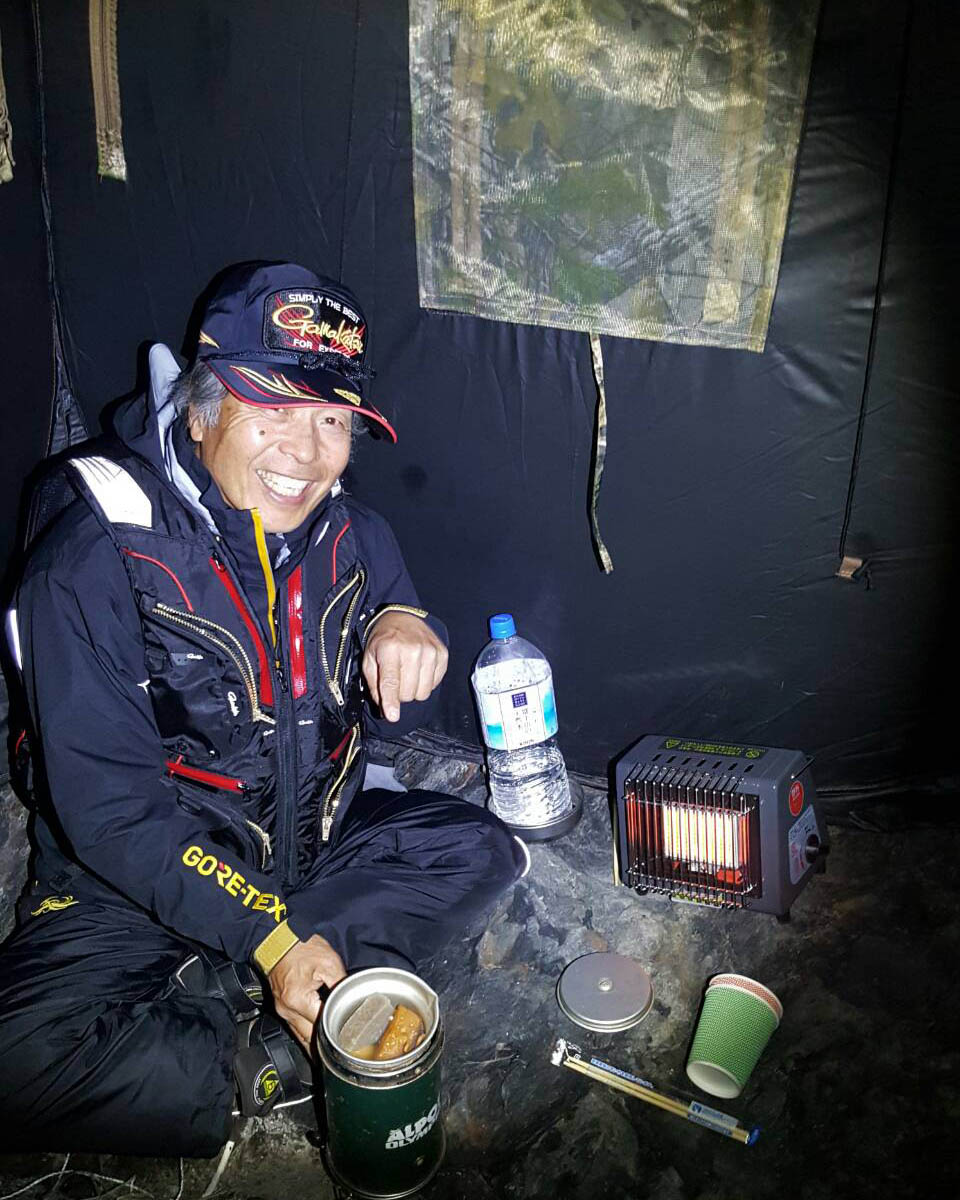 撮影用のカモフラテントを持ち込み、その中でミニストーブを使う事でした。