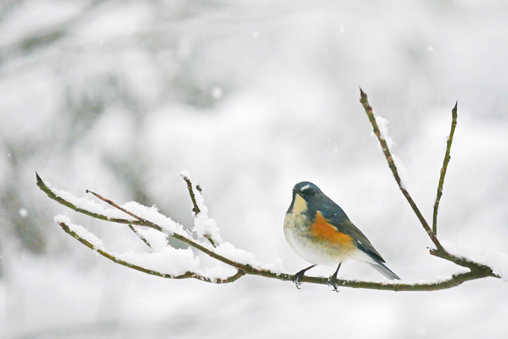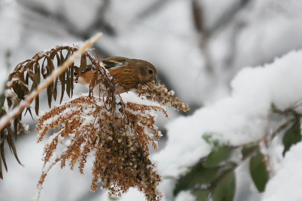 雪は降り続いていますが、入れ代わり立ち代わりやって来る小鳥達に、時間の経つのも忘れてシャッターを切ります。思惑がピシャリと当り、ベニマシコがイタドリとセイタカアワダチソウに来ました。更にはルリビタキも置いたハゼの実に来たのでした。