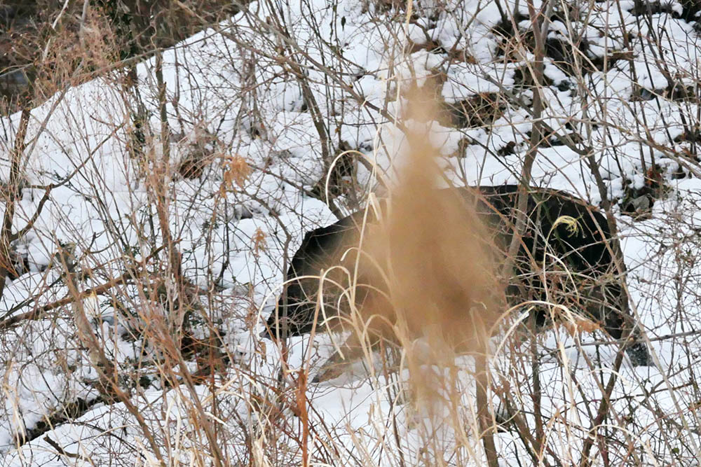 ホウキで雪を掃いてエサを撒きます。直ぐ下の天然イタドリと、持ち込んで置いていたセイタカアワダチソウの雪を落としてベニマシコに期待、ハゼの実を置いている木の雪を払って、ハゼの実が着いた枝も追加で置いてルリビタキにも備えます。