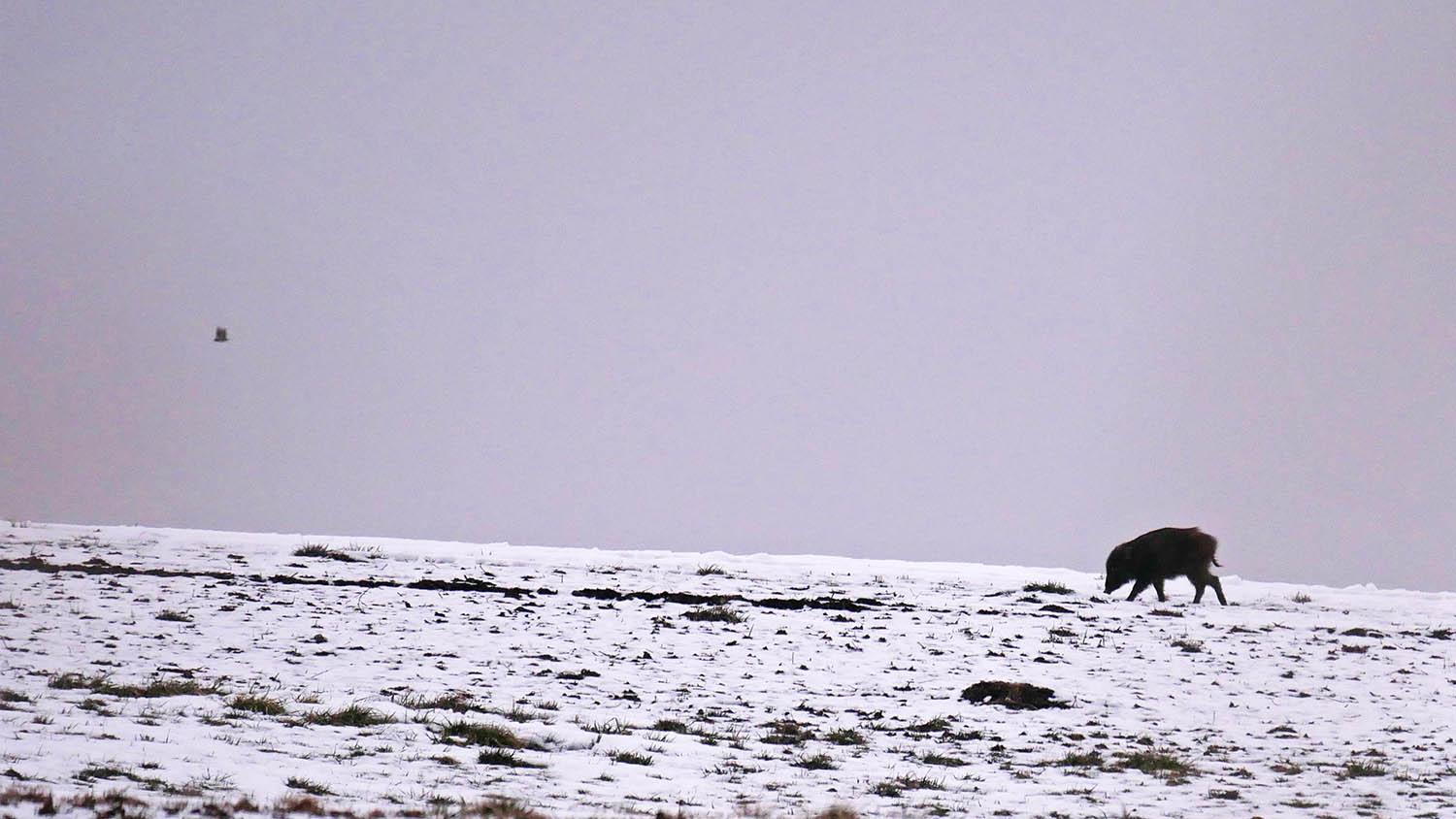産山の高原を歩く70㎏級?の猪を道案内する小鳥