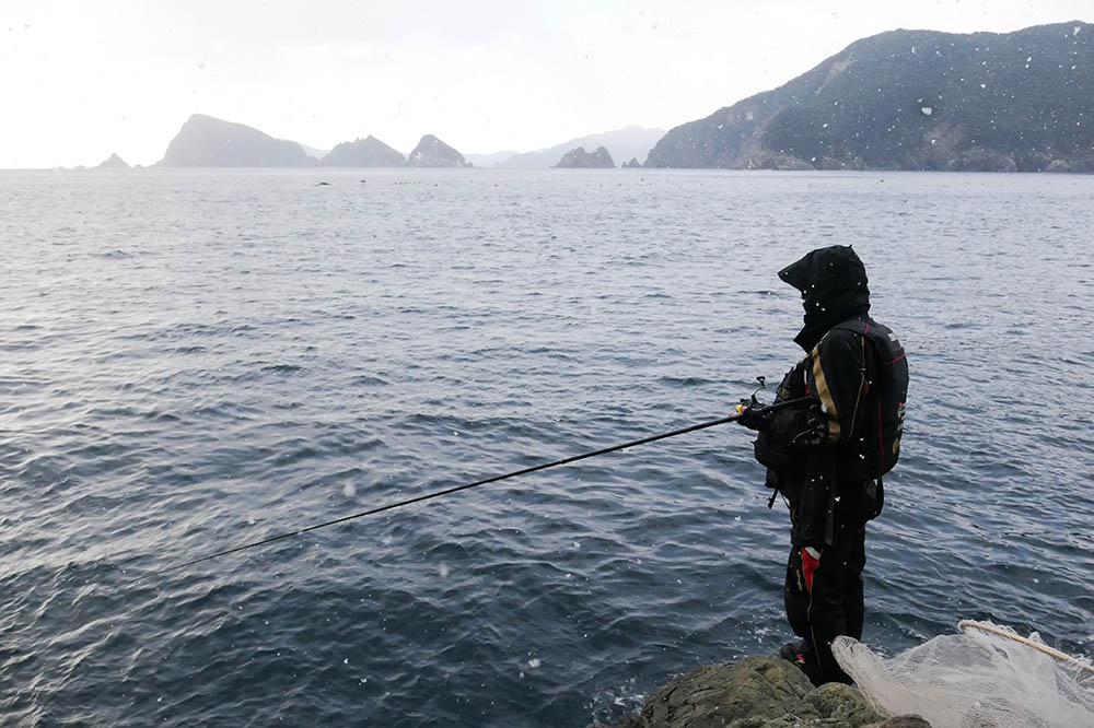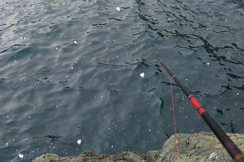 二人で上がった磯は“金山”(かなやま)。磯が混んでいる時に使う程度の場所で、準備していると雪がチラつき始め、釣り始める頃には勢いを増しています。