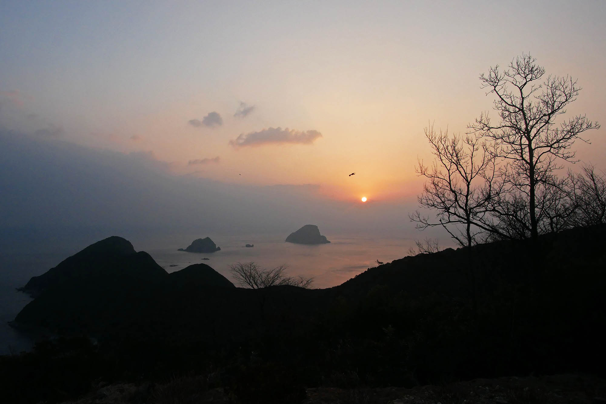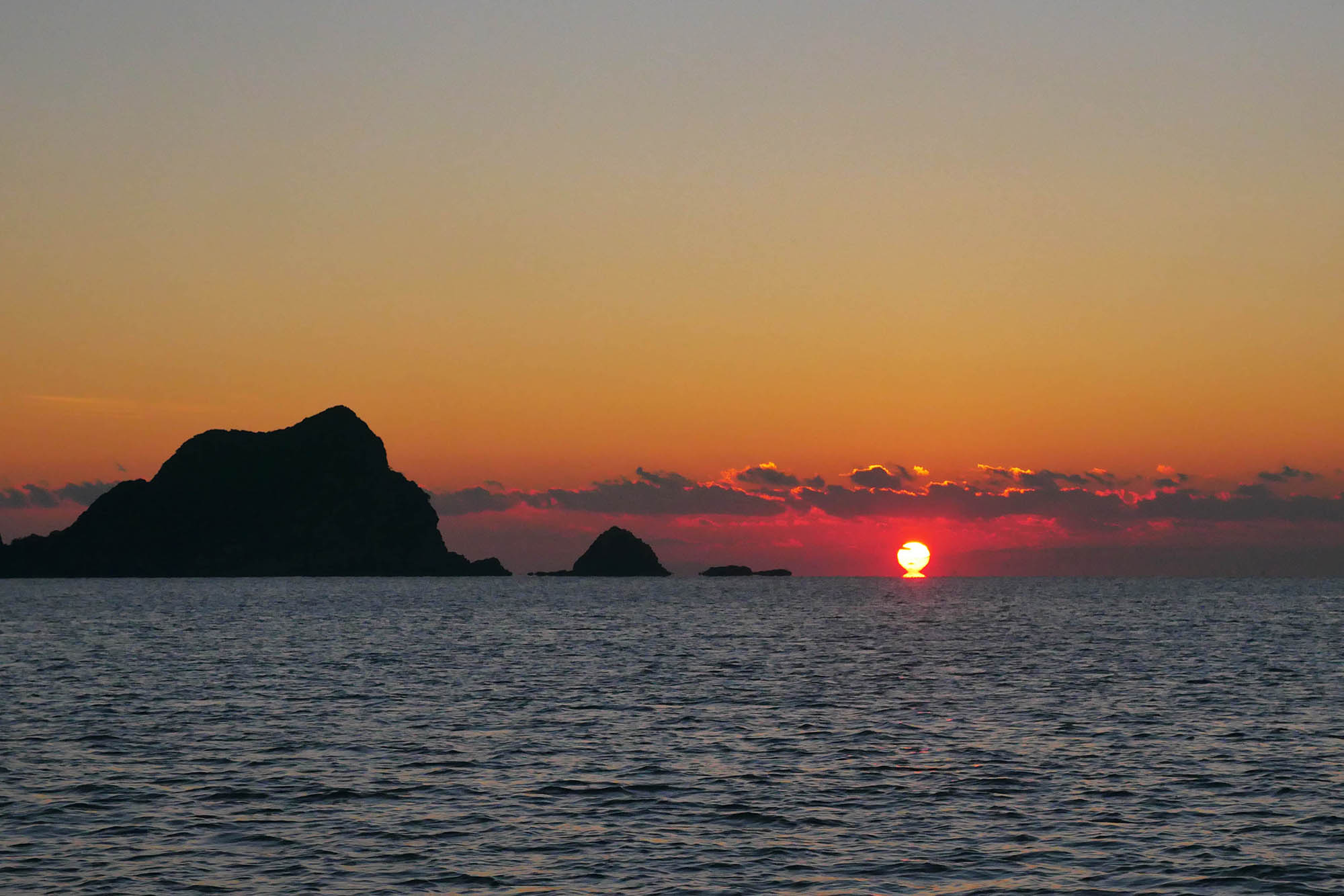 日の出に期待して諦めて仮眠。日の出時間は7時18分ですが水平線方向には雲が広がったまま。雲の上から顔を覗かせた朝日を写したのは7時35分頃になったのです。