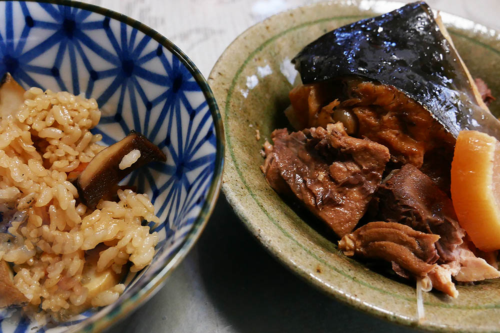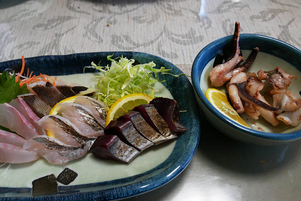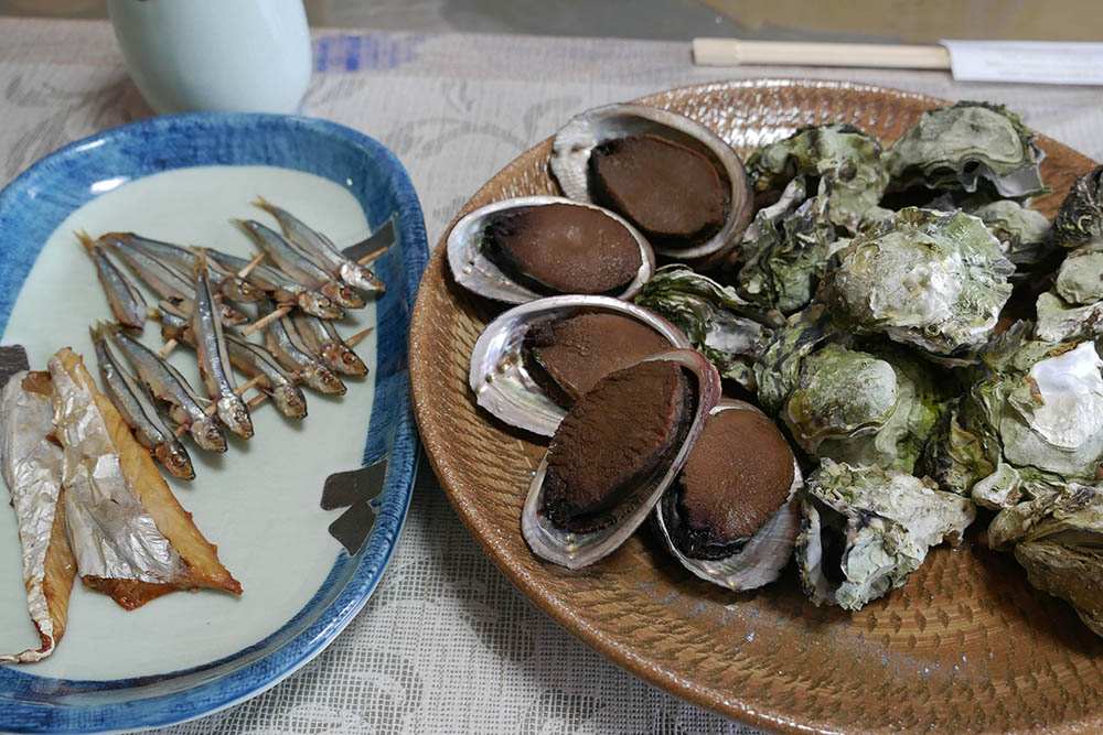 名物のトコブシ飯、とても美味しいのですが2人で5合の量は無理。岩ガキは冬でも旨い、イシダイ・タチウオ・カツオの刺身も難なく胃袋に収まります。イセエビも結構な型ですが二人で一匹のお味噌汁は贅沢です。そして10㎏のブリの浸けは絶品でした。