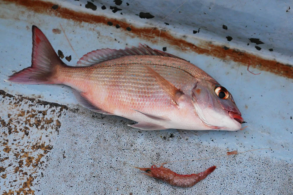 18mの底一杯で小型マダイが1匹のみ。その他はムキミに変えるとアジゴばかりです。