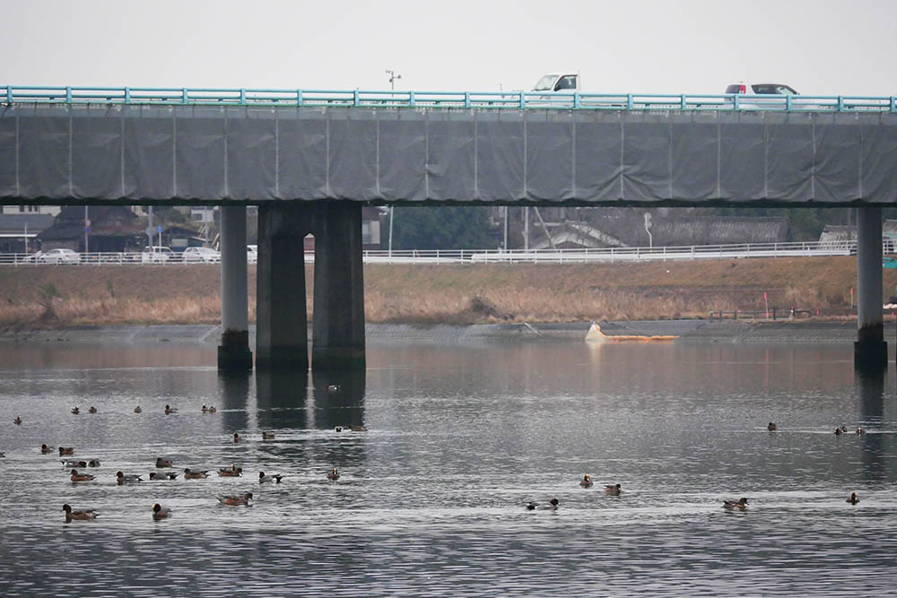 水面にはカモ類が沢山浮いていて、それぞれが潮の満ち干に応じて採餌。