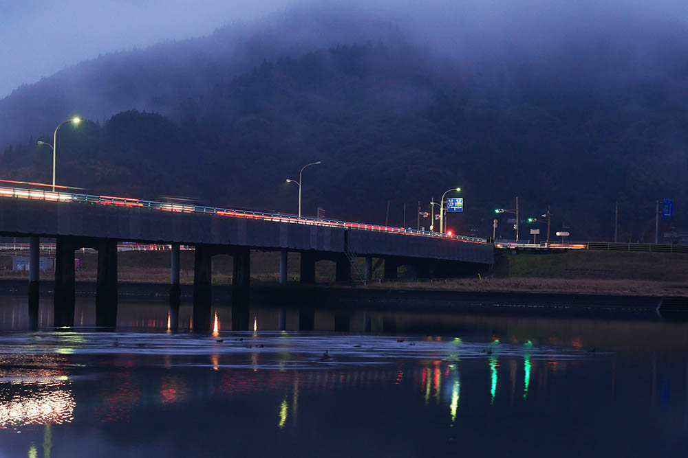 夕刻の佐伯大橋と水鳥たち