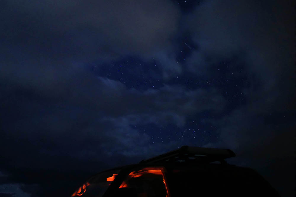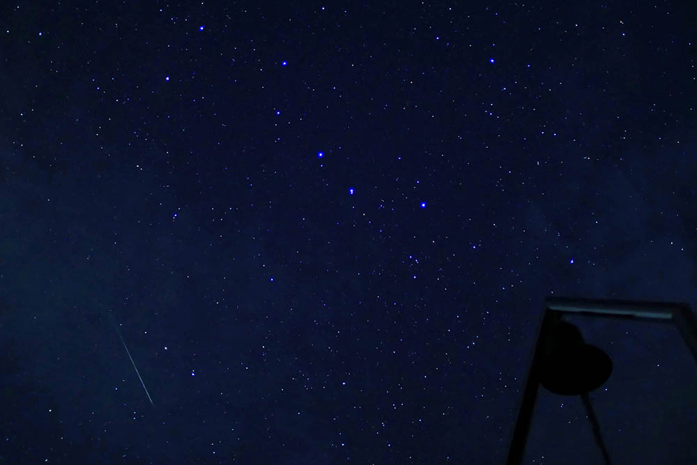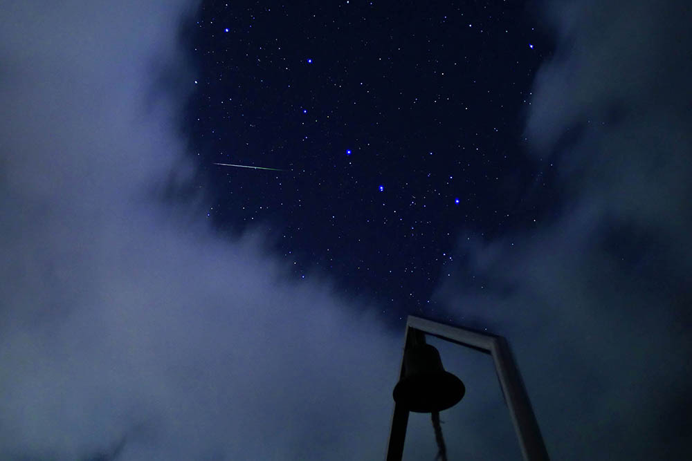 今年初めて、明るくて長く尾を引く流れ星が飛びました。本当に残念ですが、中空から輝いて落ちて行った流れ星は、その全てがフレームに収まる事はありませんでした。