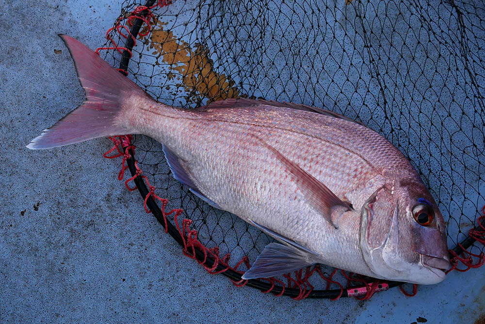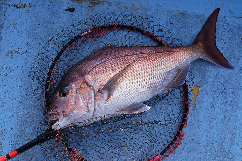 8時出港~12時納竿の短期決戦は、水深30mの半分ほどの水深で小型マダイ、25mほど沈んで道糸を引っ張ったのは60㎝級のナイスサイズ。湾内と違って小型から中型マダイが多いのが、この場所の特徴かもしれません。