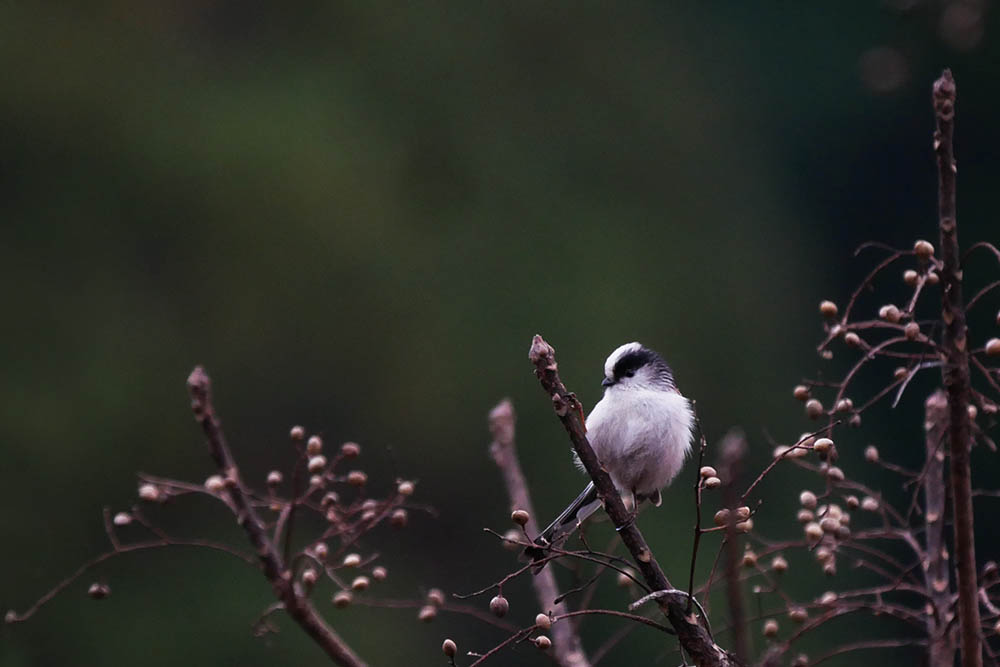 留鳥のエナガ、ハゼの実を少しずつ啄んで食べます