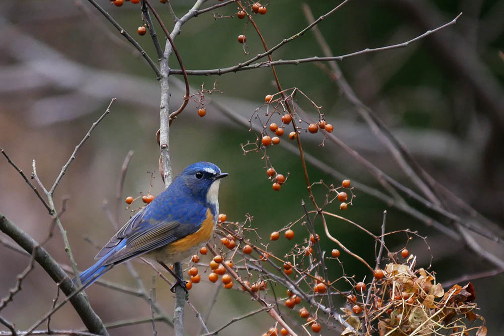 冬鳥のルリビタキ♂、ハゼの実を丸のみします