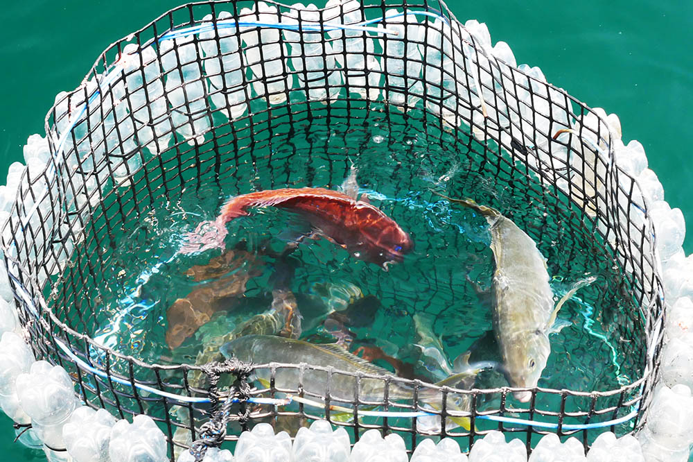 大きな活かし籠を海中に入れて釣ります