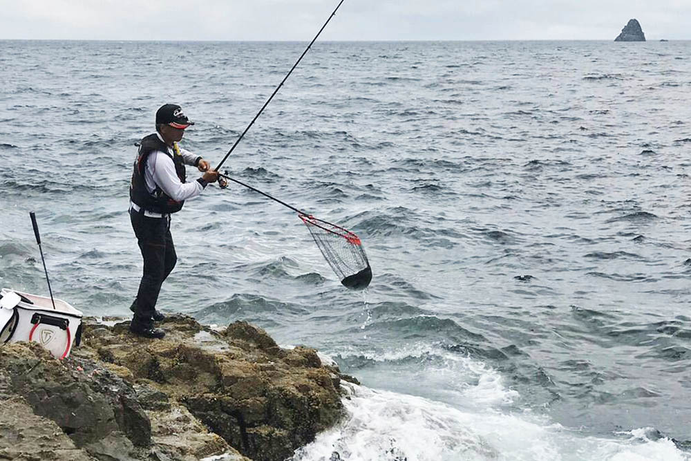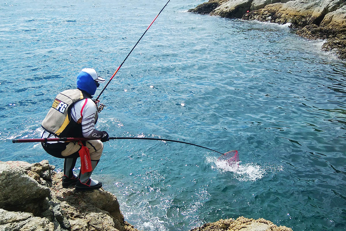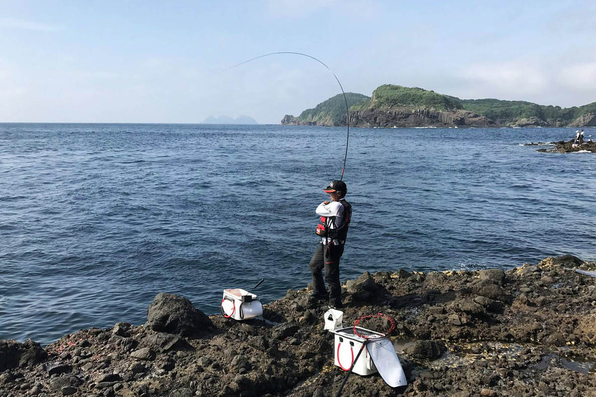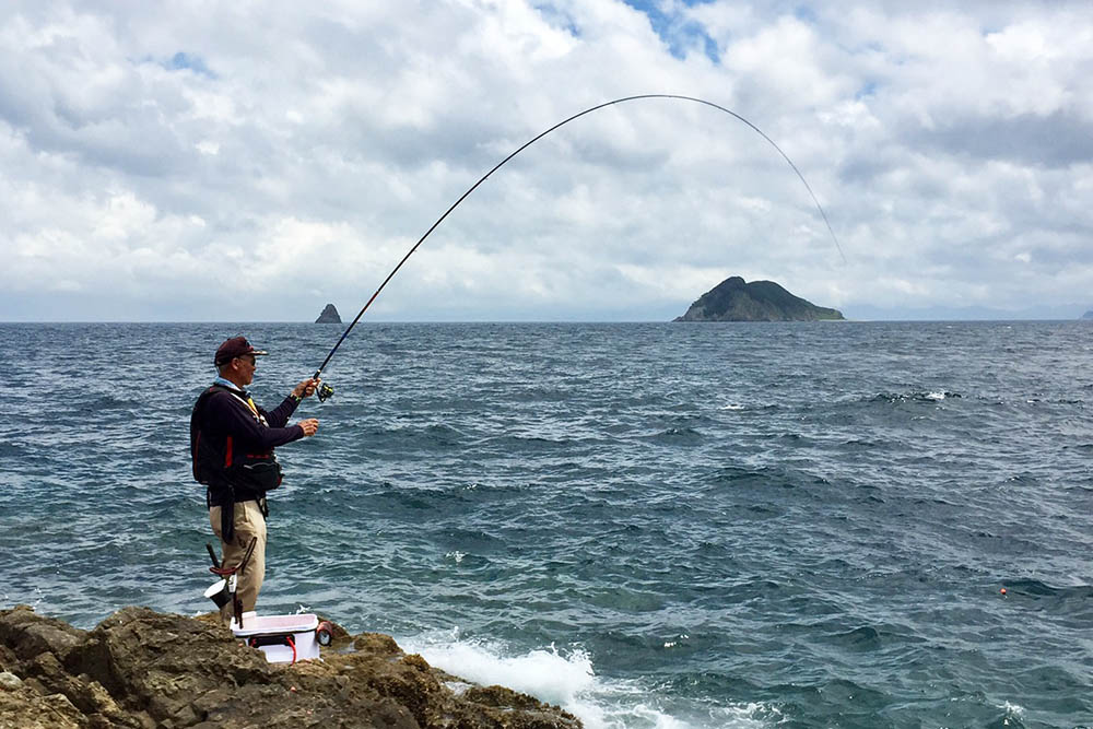 隣の磯で竿を曲げる福住会長、相手はカンさん