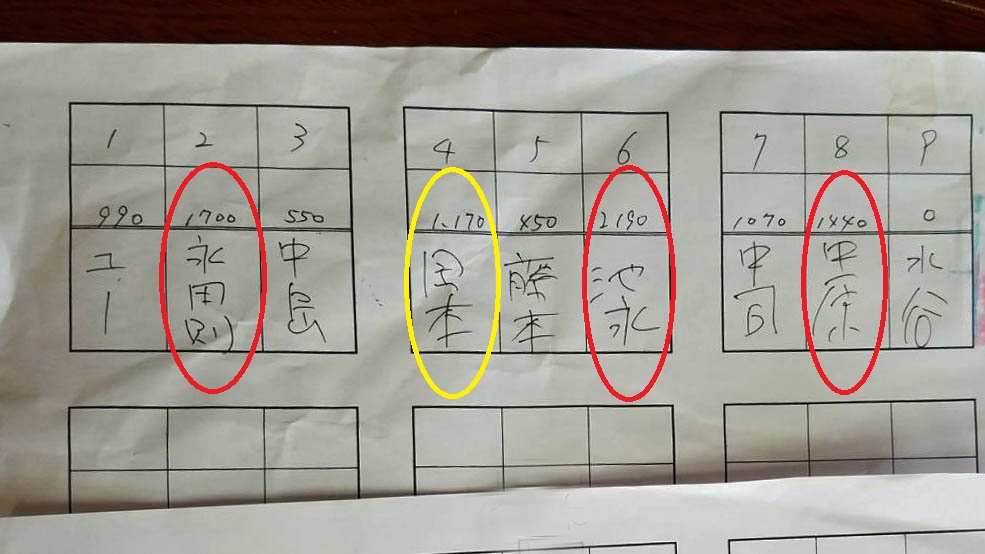 いよいよ準決勝戦、3人一組の3組に分かれて勝者3人を決め、敗れた6名の中で成績の良い1名を選び出す試合が始まります。抽選の結果、私のパートは大分から一緒に来たふじもんと、紅一点の覇者であるみどりちゃんでした。