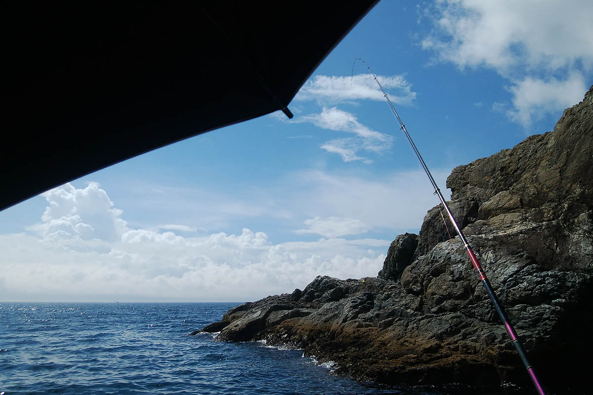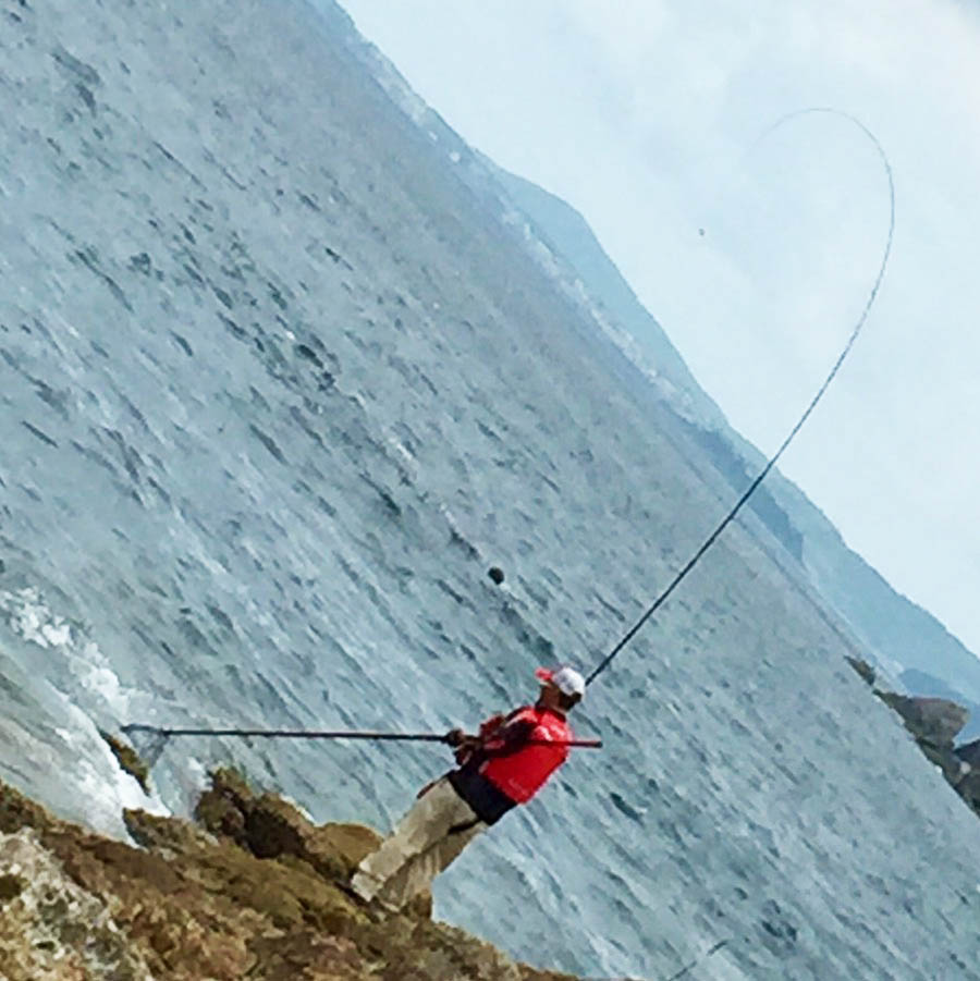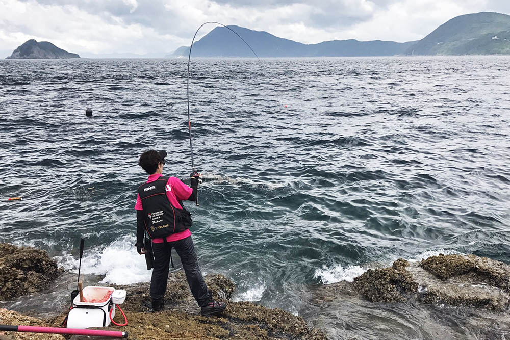 ポイントは一つ右に変わります。沖を狙うべく磯際に近い部分に多めにマキエを打ってその場所へ仕掛けを投じます。その仕掛けにグレやキロ級のオナガがヒットです。沖に遠投すると、かなり速い潮が右側の境界線まで仕掛けを運んでしまいます。