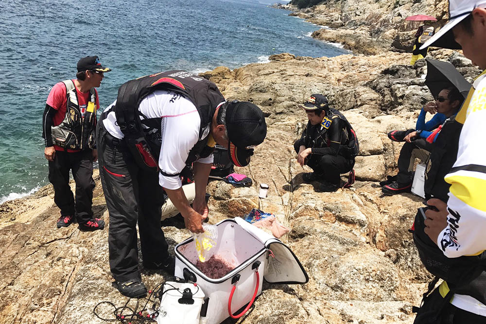 私が引いたクジは4番、第一試合の対戦相手は3番のリーさんで、場所は“尾上の北”でした。結果的に勝利しましたが、遠投での釣りはイサキの小型が非常に多く、どちらかというと、エサ取りのスズメダイの下にいるグレを拾えたことが勝因です。