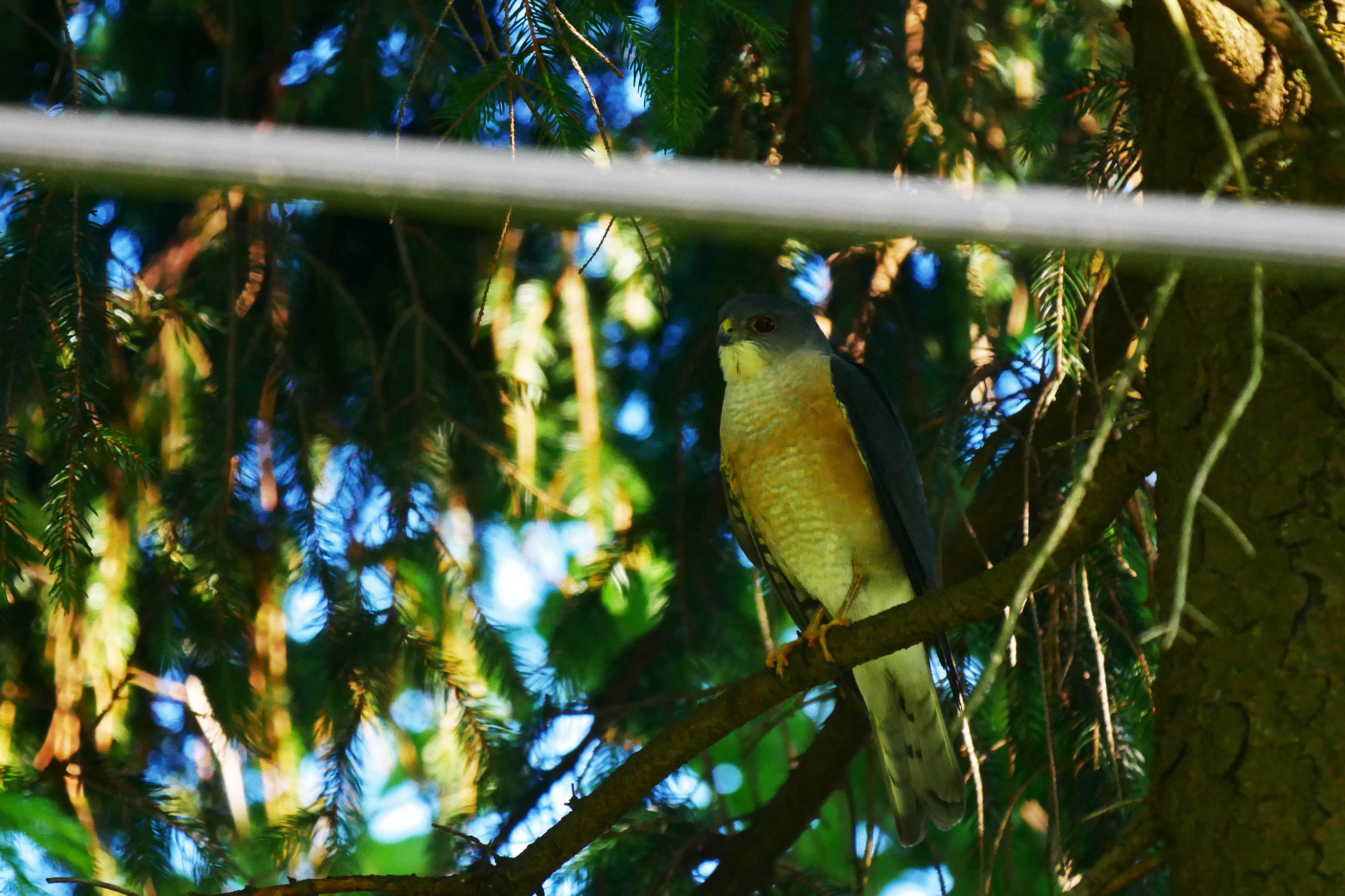 そのコルリを撮影するために、日影に隠れて待っていた時、大き目の鳥が直ぐ上の枝に止まりました。色合いからジュウイチと思って数ショット撮ると、直ぐに飛び去りました。良く確認せずに帰宅、PCで見ると猛禽類のツミでした。胸の色・背中の色・大きさがジュウイチとほぼ同じくらいなので、見違えてしまったのです。