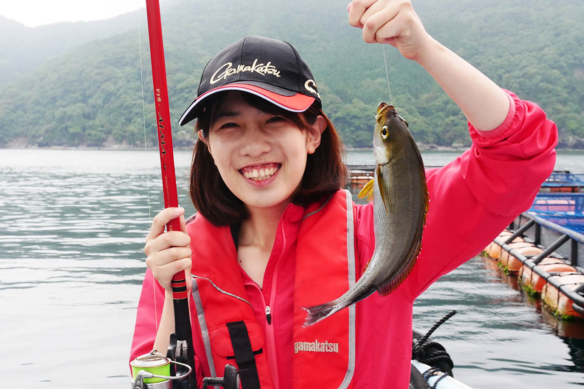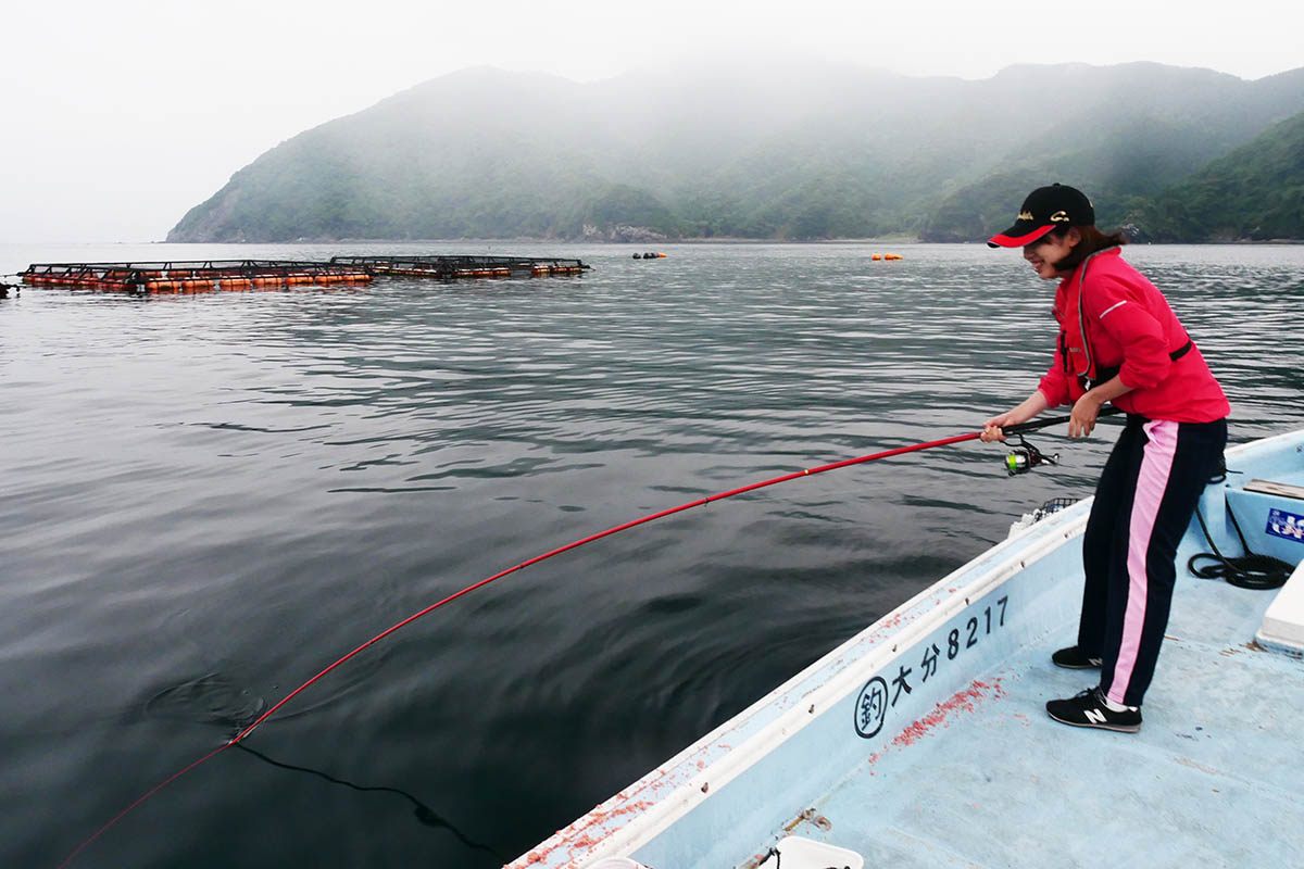 奥のイケスで竿を曲げるまりん
