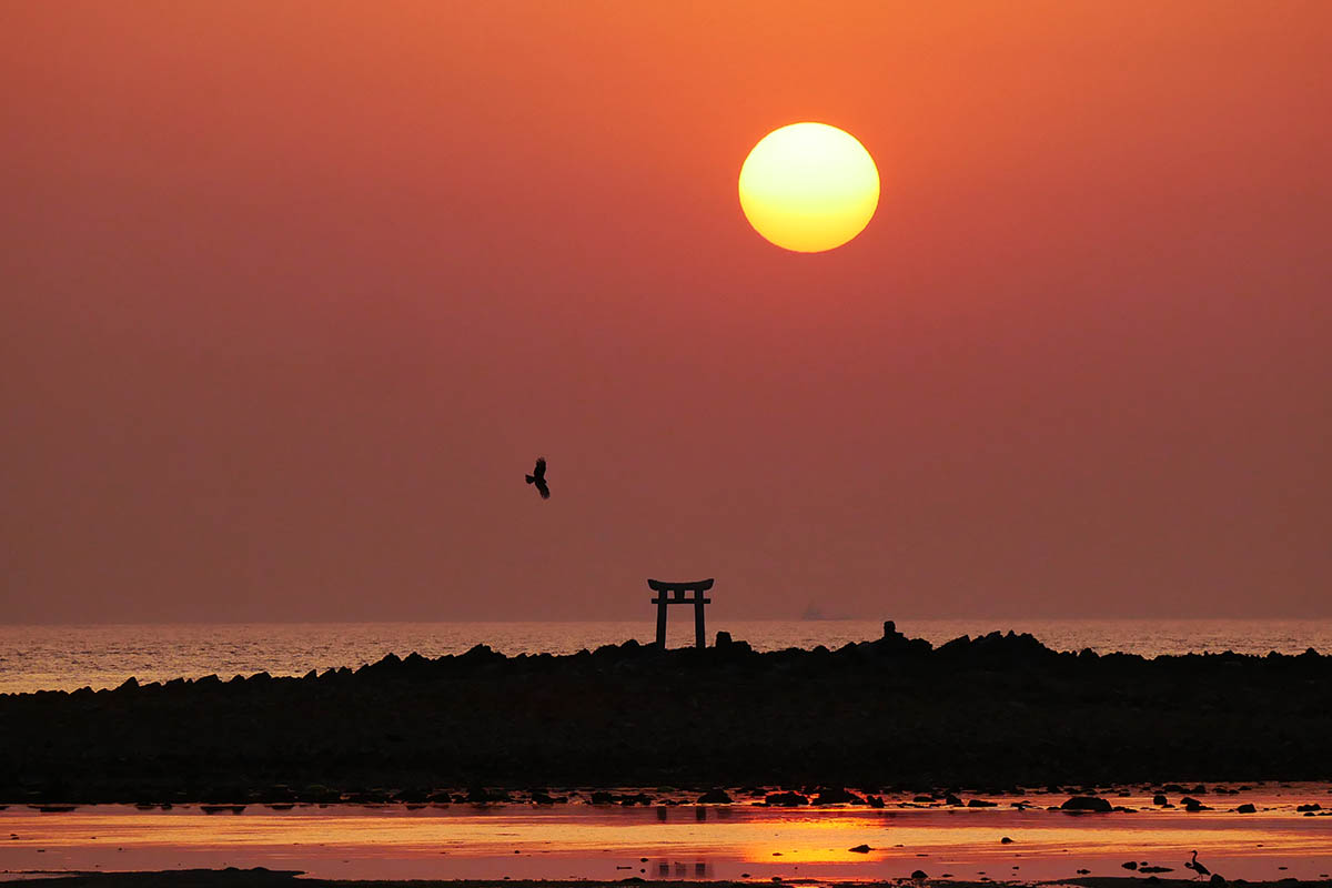 この時期は浮き洲の鳥居に沈む夕日が見られます