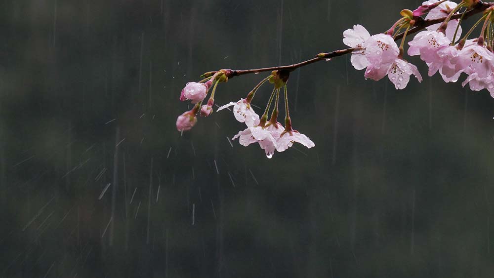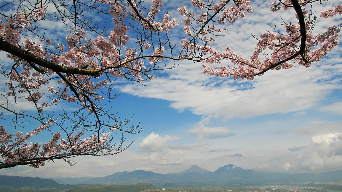 ソメイヨシノは満開、由布・鶴見は曇り空で今一歩