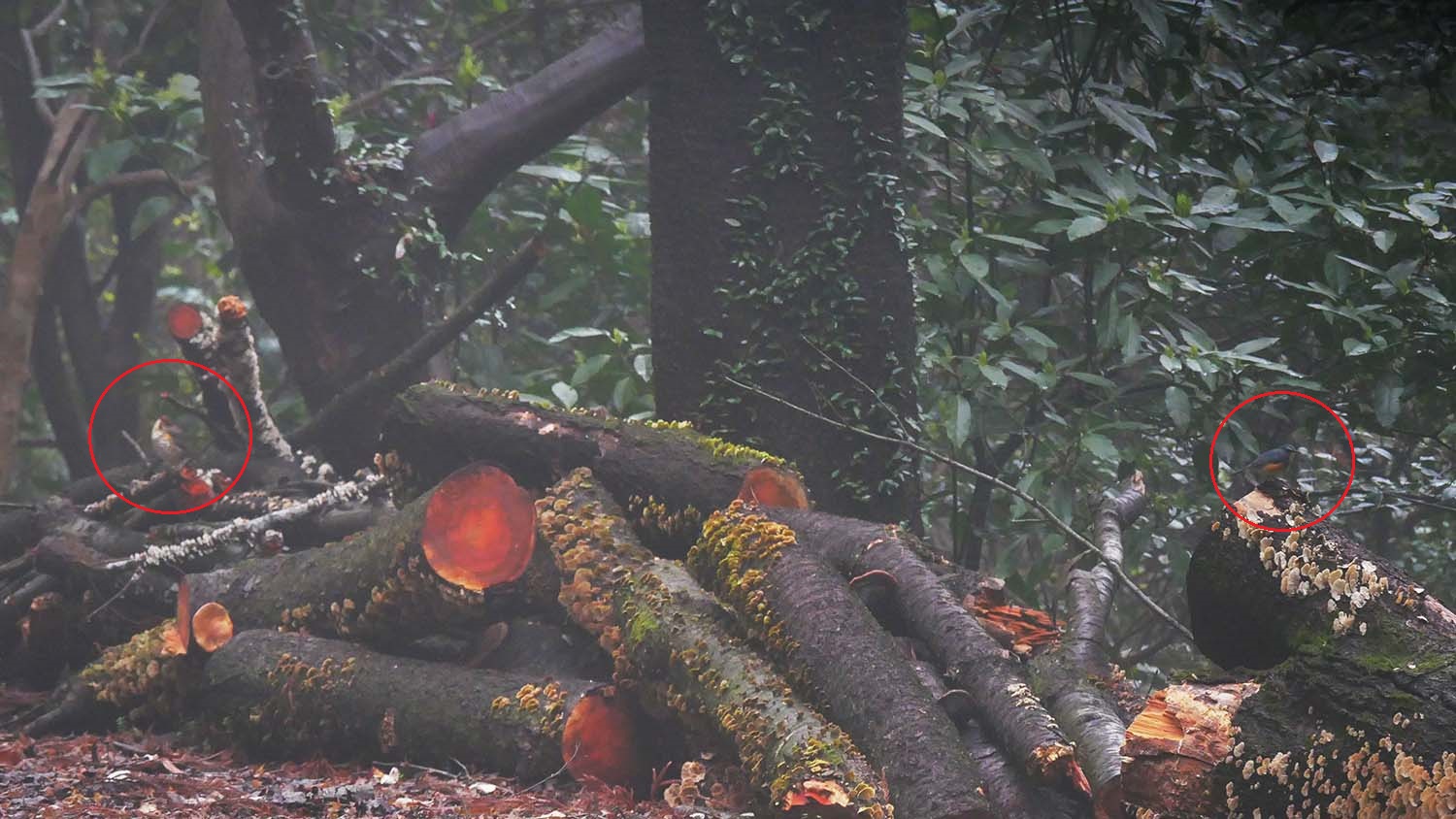 冬鳥のルリビタキの♂と夏鳥のクロツグミの♀