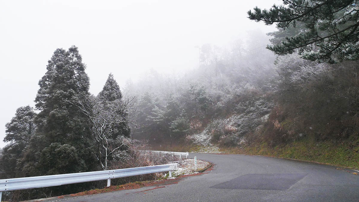 県民の森の13時過ぎ、外気温は真冬日の気温です
