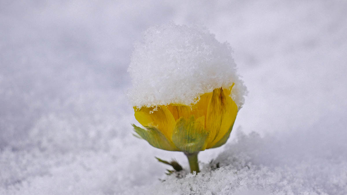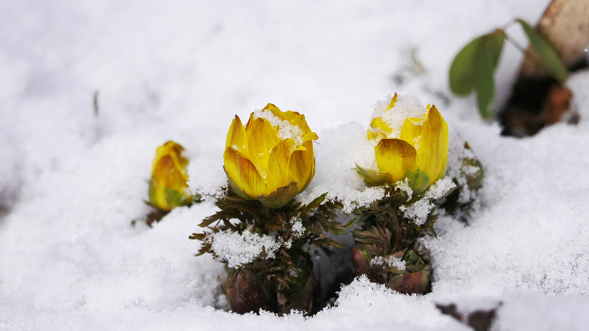 近付くと、ポツンポツンと雪の下から黄色い花弁が顔を出しています。