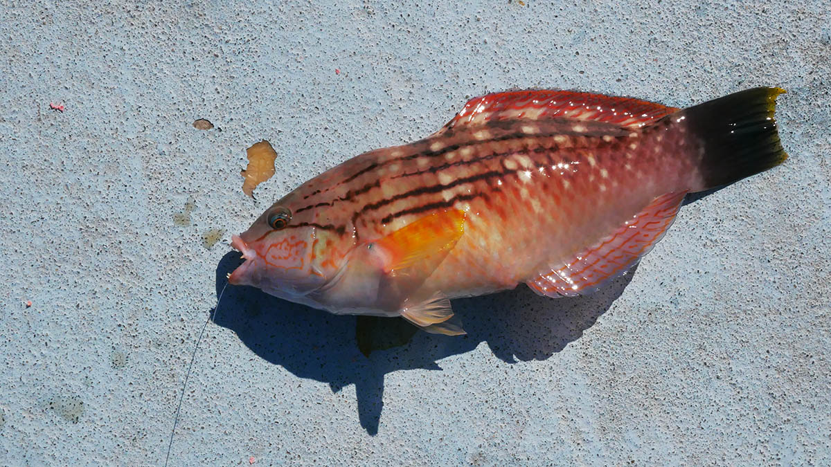 オキアミと集魚剤のマキエを打ちながら、40mくらいは水深があるポイントを攻めましたが、ベラ1匹・小型ヘダイが2匹・小型チダイが1匹の釣果で15時に終了。