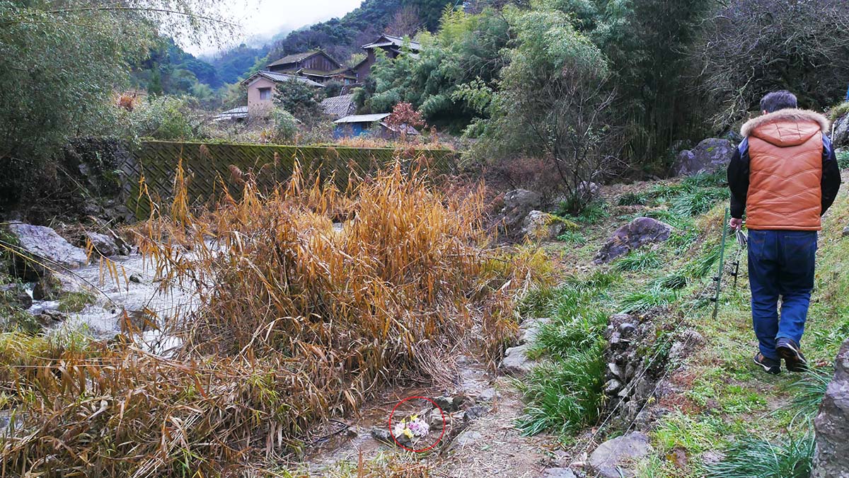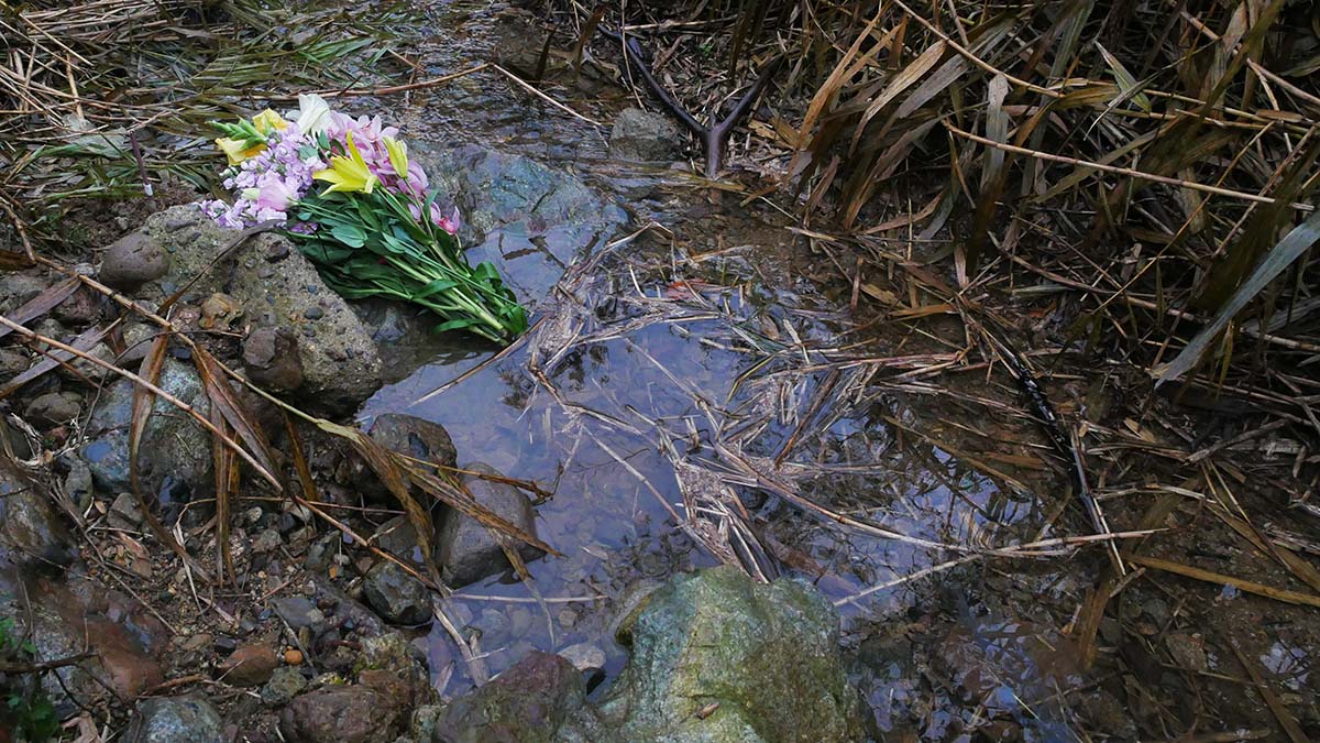 その足で、石を枕に寝た状態で発見された場所に線香と花を手向けました。