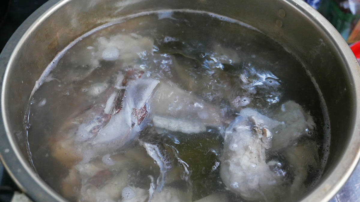 ②鯛のアラで薄めの海潮汁を作り、それを使ってご飯を炊く水分にする。