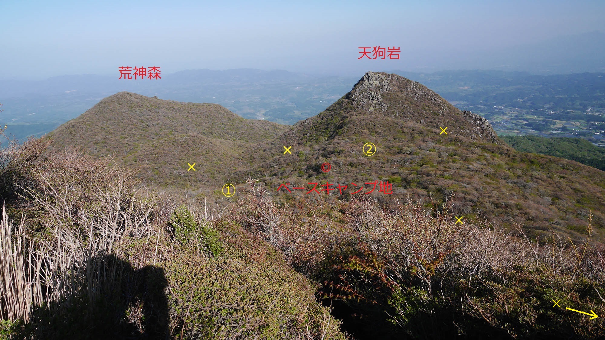 その後は夕刻まで撮影ポイントを探すため、強風の中を天狗岩方面へ行ったものの、頂上は危険と判断して諦めました。反対方向の高塚山にも登ると、こちらは木々が多くて頂上でも安全でしたが、岩の上に立つと危うく吹き飛ばされそうになりました。