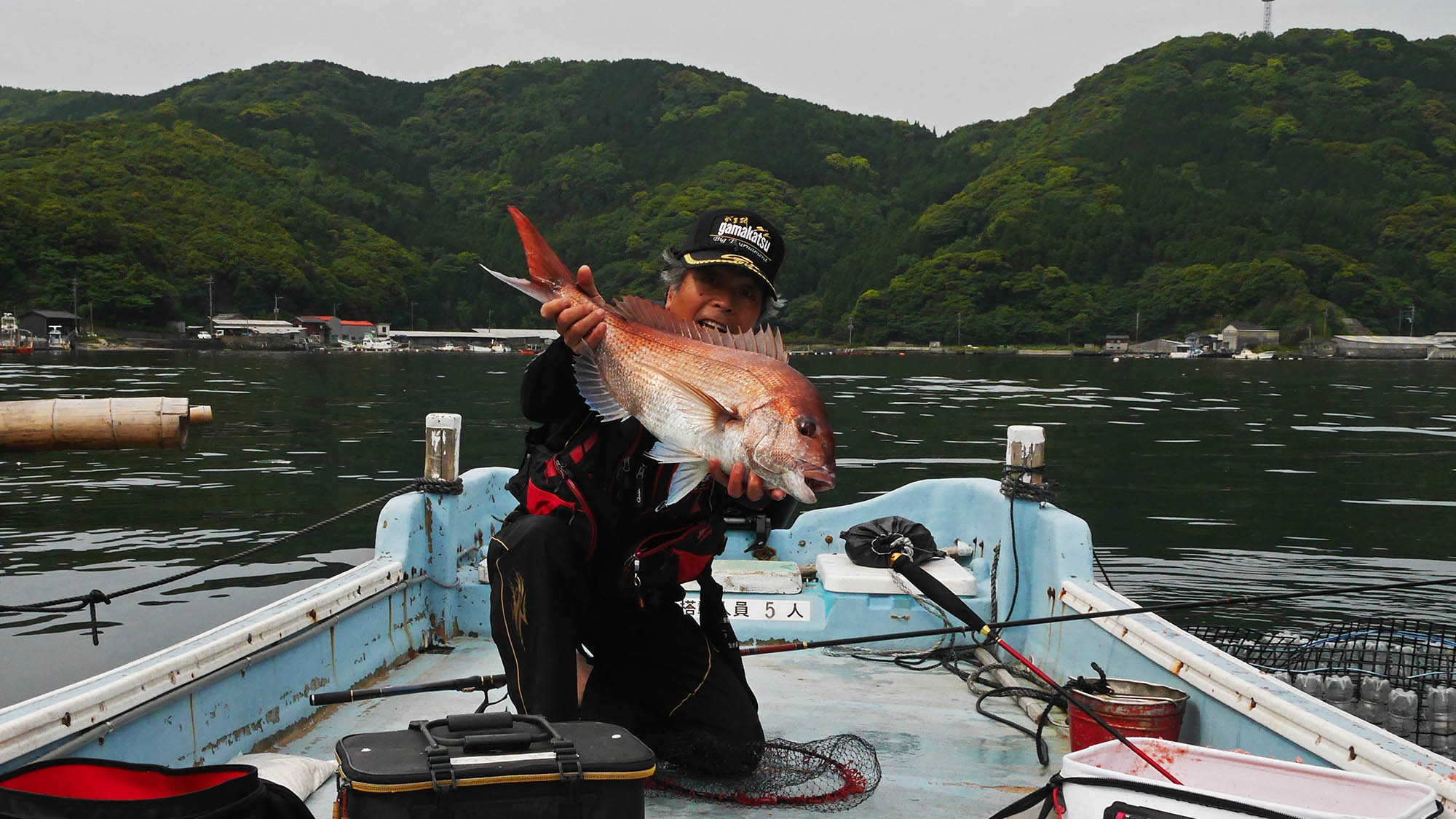 一投目に50アップのマダイ。二投目には60近いマダイ。三投目は50アップの養逃げマダイ。四投目は3㎏アップのマダイ。五投目は更に大型で5㎏級のマダイ?六投目には50アップのマダイ。七・八投目はアタリが出ませんでした。水深は28m、喰ったタナは7~10mくらいまで、3㎏級だけは15mくらいサシエが沈んでアタリが出ました。