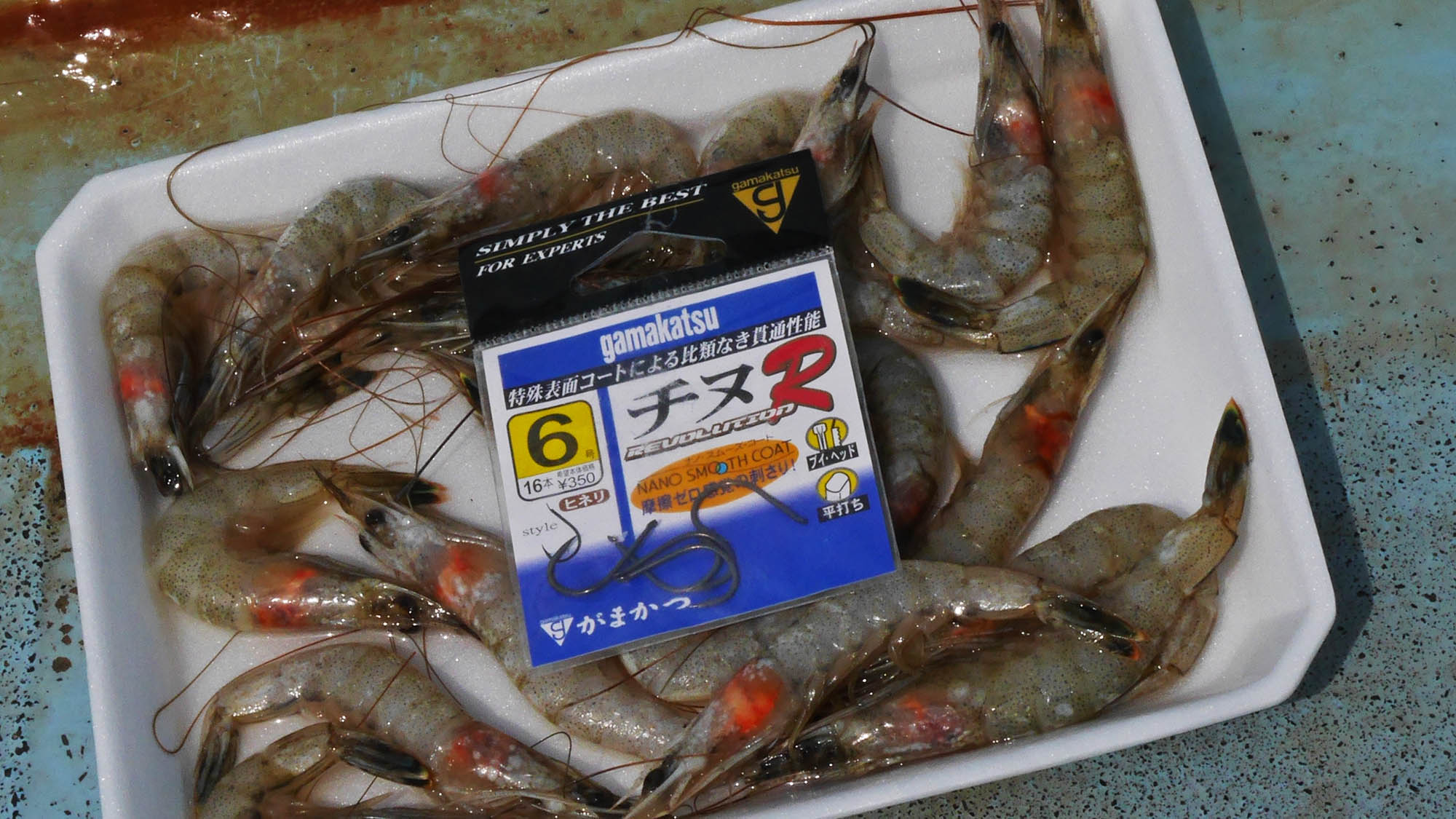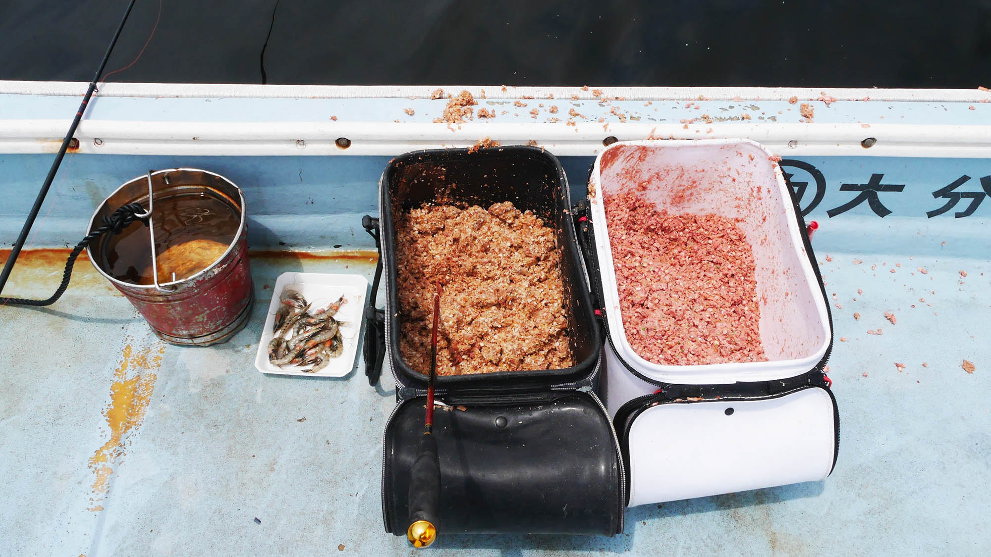 一つ目はオキアミ生9㎏+グレナビ2袋+押しムギ4㎏。二つ目はアミ8㎏+パン粉4㎏で配合です。二つ目のマキエを上手く使うことで、サバの群れを上層に引き付け、ムギの沈下を助ける段取りです。サシエは白エビのムキミを主体に使います。