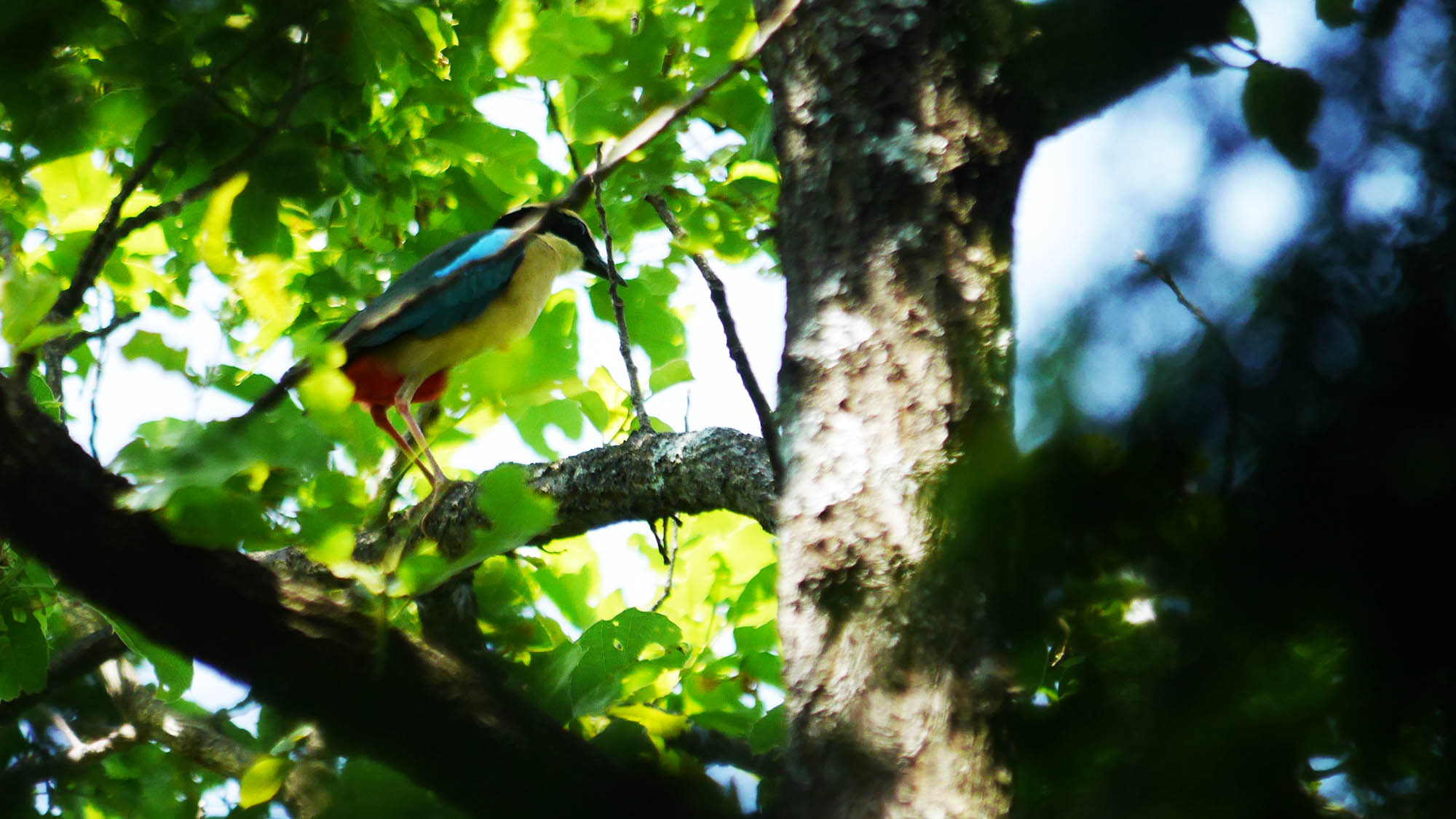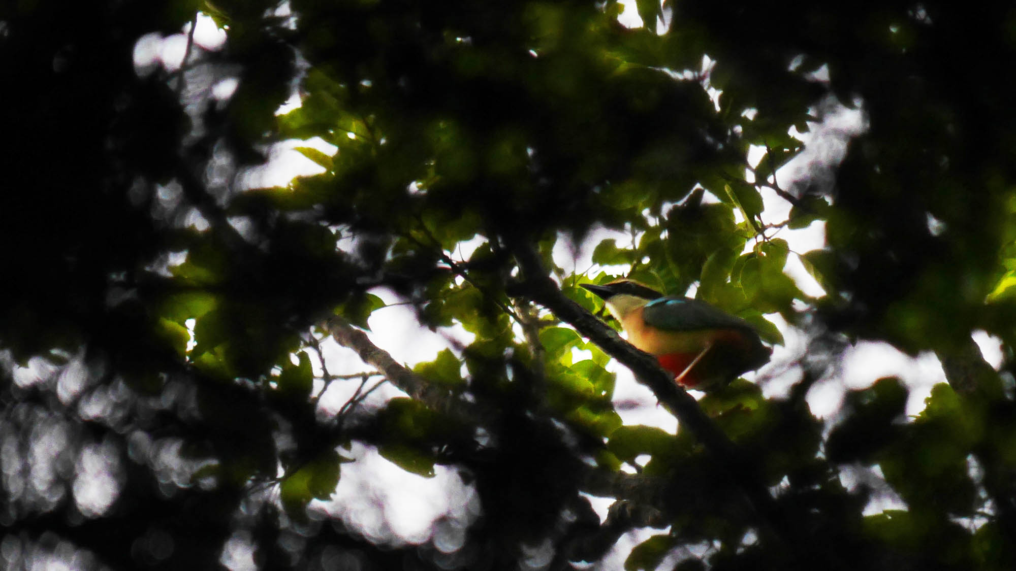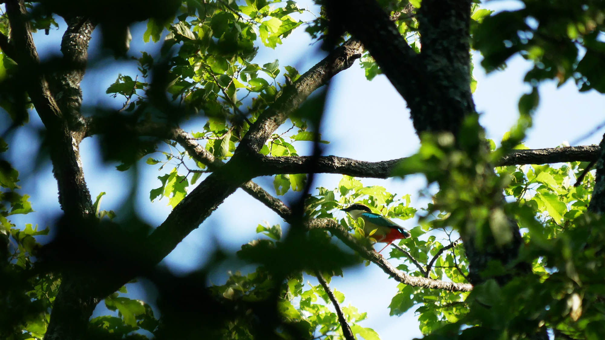 ゆっくりと少しずつ移動しながら姿を探していると、15mほど先で鳥が少し移動しました。体を更に動かしながら木々の間を擬視すると、ヤイロチョウの姿が現れたのです。